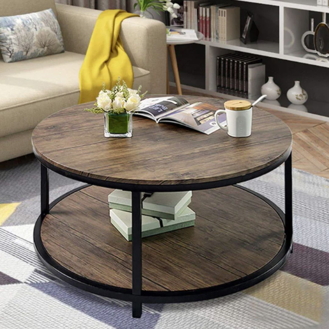 Thiết kế bàn tròn của bàn trà gỗ hai tầng mang lại cảm giác mềm mại, an toàn và thân thiện khi sử dụng. Không có góc cạnh sắc nhọn, mẫu bàn này phù hợp với gia đình có trẻ nhỏ hoặc không gian sinh hoạt chung thường xuyên di chuyển. Dáng tròn còn giúp bàn dễ dàng phối hợp với sofa chữ L, sofa cong hoặc sofa băng dài.