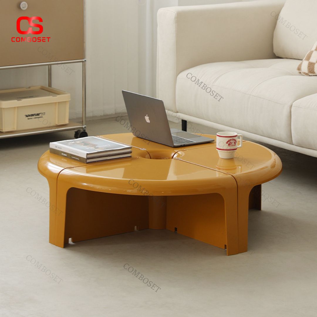 Khi ghép đủ bốn khối lại, bàn tròn cafe bốn góc trở thành bàn trà trung tâm nổi bật. Màu sắc tươi sáng như vàng cam giúp không gian thêm sinh động, tạo điểm nhấn nổi bật giữa sofa sáng màu.
