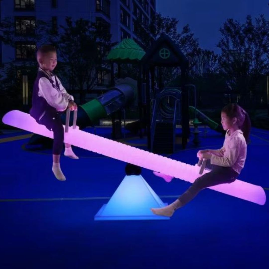 Với khả năng phát sáng mạnh mẽ và thay đổi màu sắc linh hoạt, bập bênh phát sáng là lựa chọn hoàn hảo cho các lễ hội ánh sáng, sự kiện nghệ thuật hay chương trình trình diễn ngoài trời. Khi được lắp đặt theo hàng dài hoặc cụm mô phỏng hình học, bập bênh trở thành một phần trong không gian sân khấu – tạo hiệu ứng ánh sáng sống động, cuốn hút và đầy sáng tạo. Mỗi chuyển động lên xuống của người chơi như một nốt nhạc, kết hợp cùng sắc màu thay đổi liên tục, biến toàn bộ khu vực thành một bức tranh ánh sáng khổng lồ.