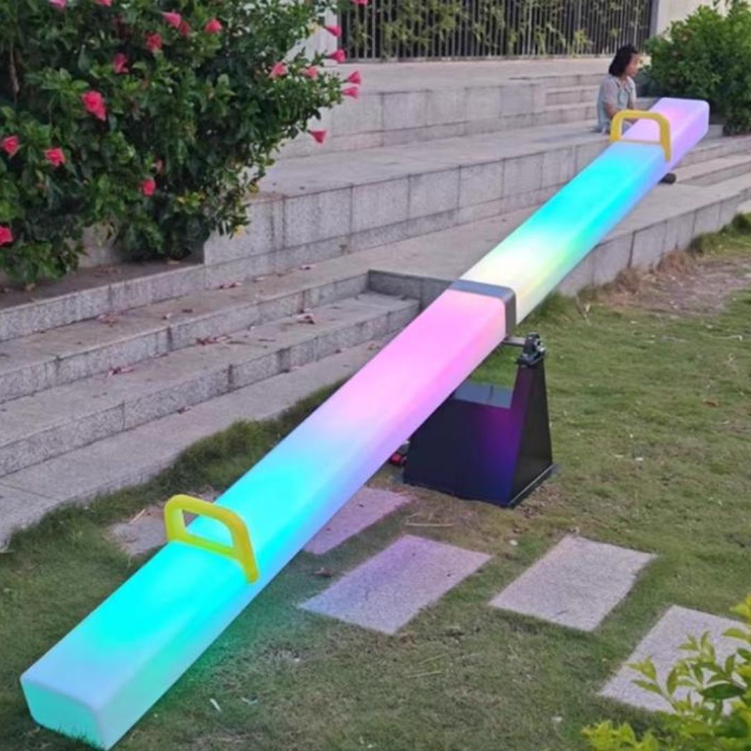Mỗi chiếc bập bênh phát sáng giống như một thanh ánh sáng khổng lồ, khi chuyển động lên xuống sẽ tạo nên những dải sáng di chuyển nhịp nhàng trong không gian — vừa vui tươi, vừa gợi cảm giác huyền ảo. Khi được lắp đặt hàng loạt tại các công viên, quảng trường, khu vui chơi, hay khu tổ chức sự kiện, những chiếc bập bênh này tạo nên khung cảnh rực rỡ và sinh động, thu hút mọi ánh nhìn.