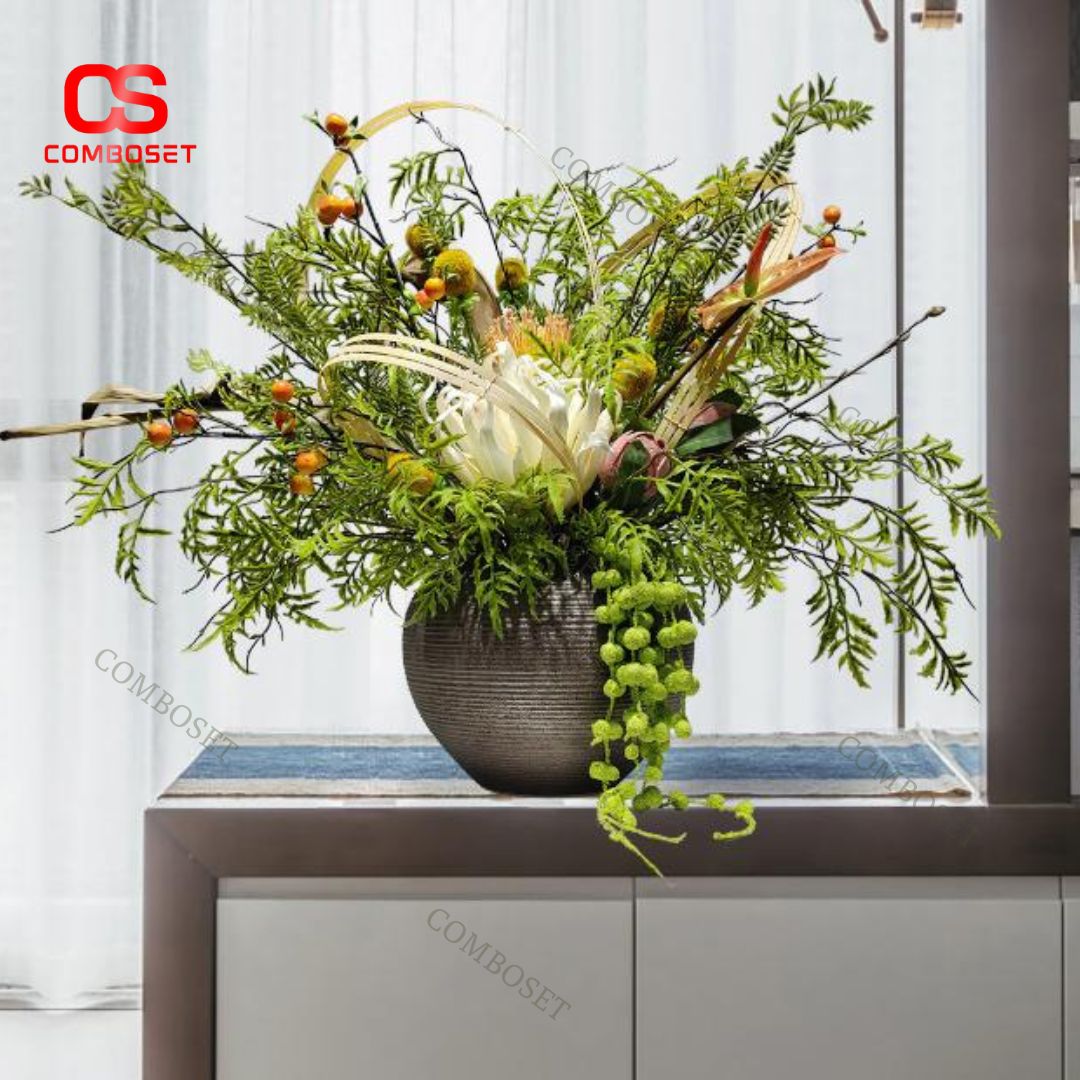 Đối với những phòng khách hiện đại, việc sử dụng bình hoa nghệ thuật bằng nhựa giúp duy trì vẻ đẹp ổn định mà không cần lo lắng về ánh sáng hay độ ẩm. Sản phẩm mang lại cảm giác xanh mát, giúp không gian tiếp khách trở nên thân thiện và gần gũi hơn.