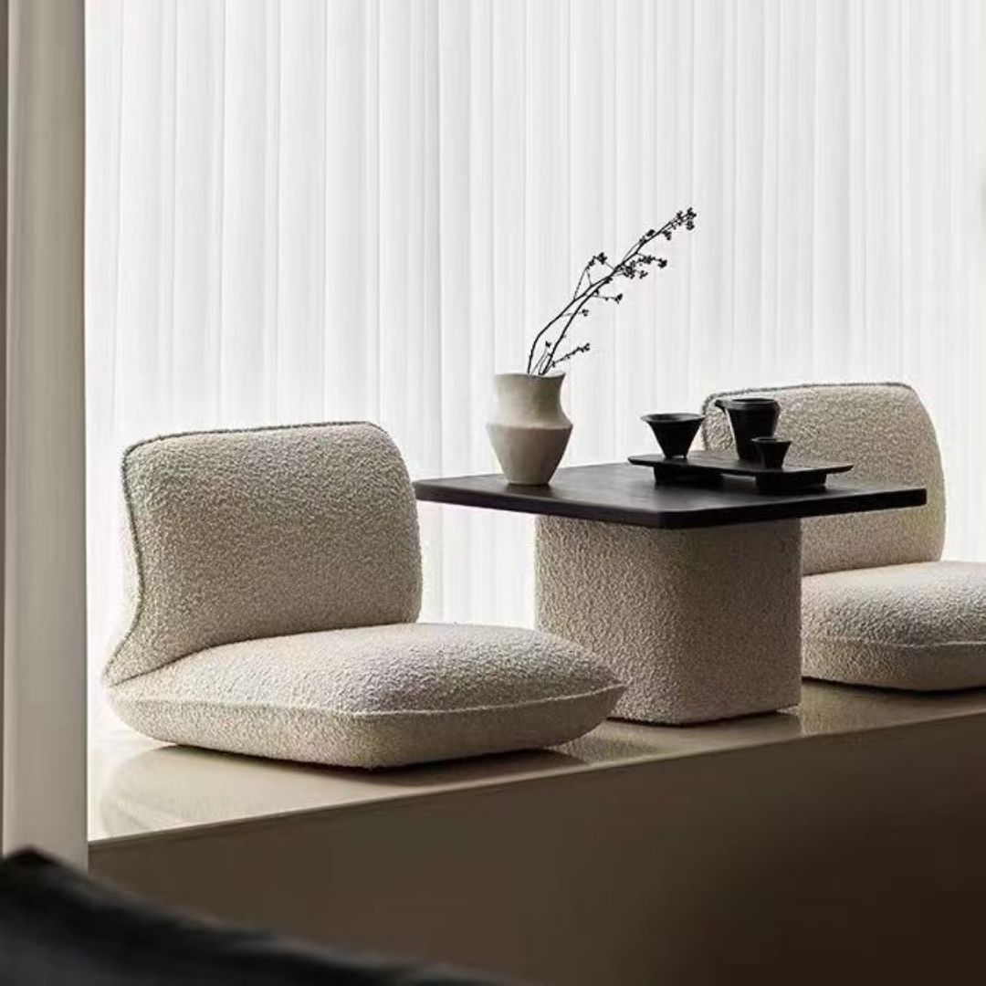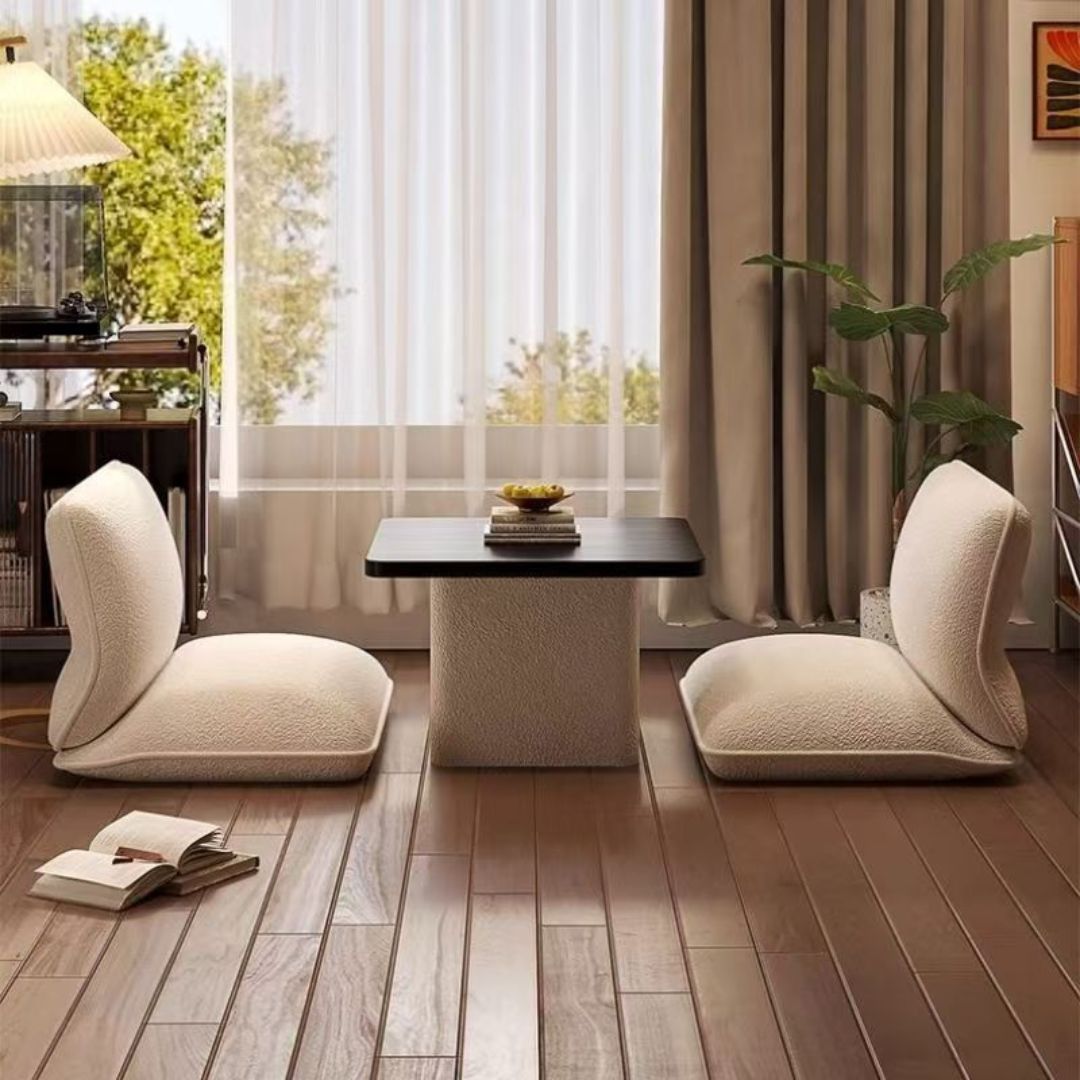 Điểm ấn tượng nhất của bộ bàn trà kiểu Nhật chính là 2 ghế ngồi bệt dáng cong mềm mại.