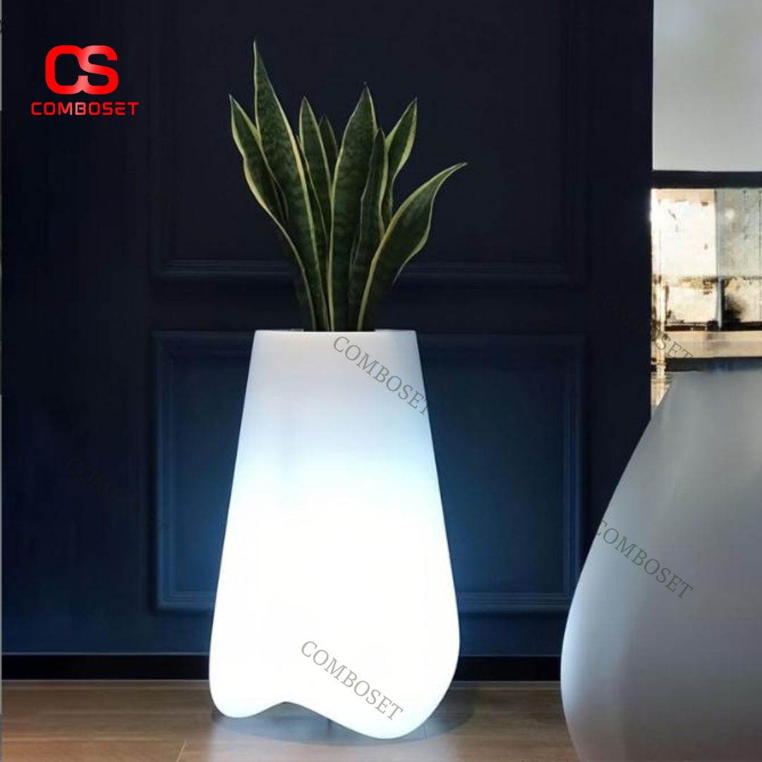 Mẫu chậu hoa led phát sáng trong hình sở hữu kiểu dáng độc đáo với thân chậu được thiết kế theo dạng thuôn từ trên xuống dưới, kết thúc bằng phần chân bo tròn mềm mại. Kiểu dáng này giúp chậu giống như một khối điêu khắc tô sáng không gian, đặc biệt khi đặt trong môi trường tối hoặc ánh sáng nhẹ. Điểm cuốn hút nằm ở phần thân chậu sử dụng nhựa mờ, giúp ánh sáng LED lan tỏa đều và dịu, không gây chói mắt, tạo cảm giác thư giãn cho người nhìn.