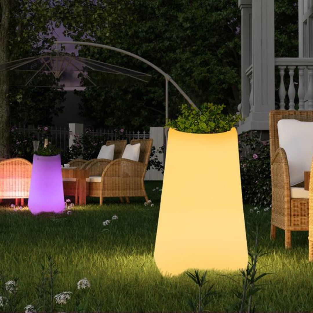 Chậu hoa LED phát sáng đang trở thành xu hướng trang trí thời thượng nhờ khả năng kết hợp giữa công năng trồng cây và hiệu ứng ánh sáng đổi màu ấn tượng. Mẫu chậu trong hình sở hữu thiết kế tối giản hiện đại, phát sáng đa màu qua remote và phù hợp sử dụng cả trong nhà lẫn ngoài trời. Với chất liệu bền, chống thấm và an toàn, chậu LED là lựa chọn lý tưởng cho sân vườn, quán café, resort hay các không gian cần điểm nhấn về đêm.