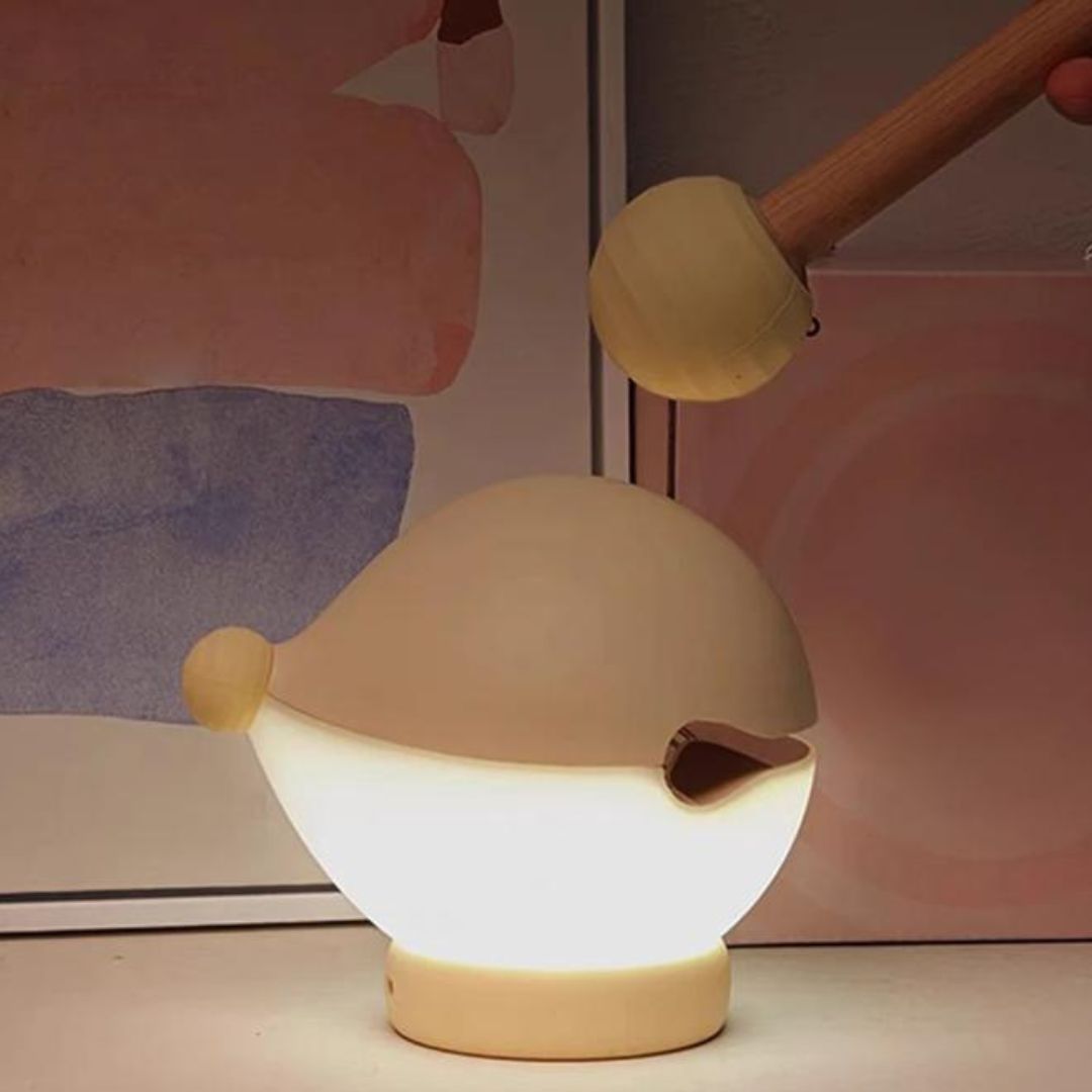 Không cần công tắc phức tạp, chỉ cần gõ nhẹ lên đầu đèn hoặc dùng chiếc búa mini kèm theo, bạn có thể bật/tắt và thay đổi màu sắc ánh sáng dễ dàng. Đây chính là điểm nhấn “vui nhộn” khiến chiếc đèn trở nên độc đáo hơn hẳn các loại đèn bàn thông thường.
