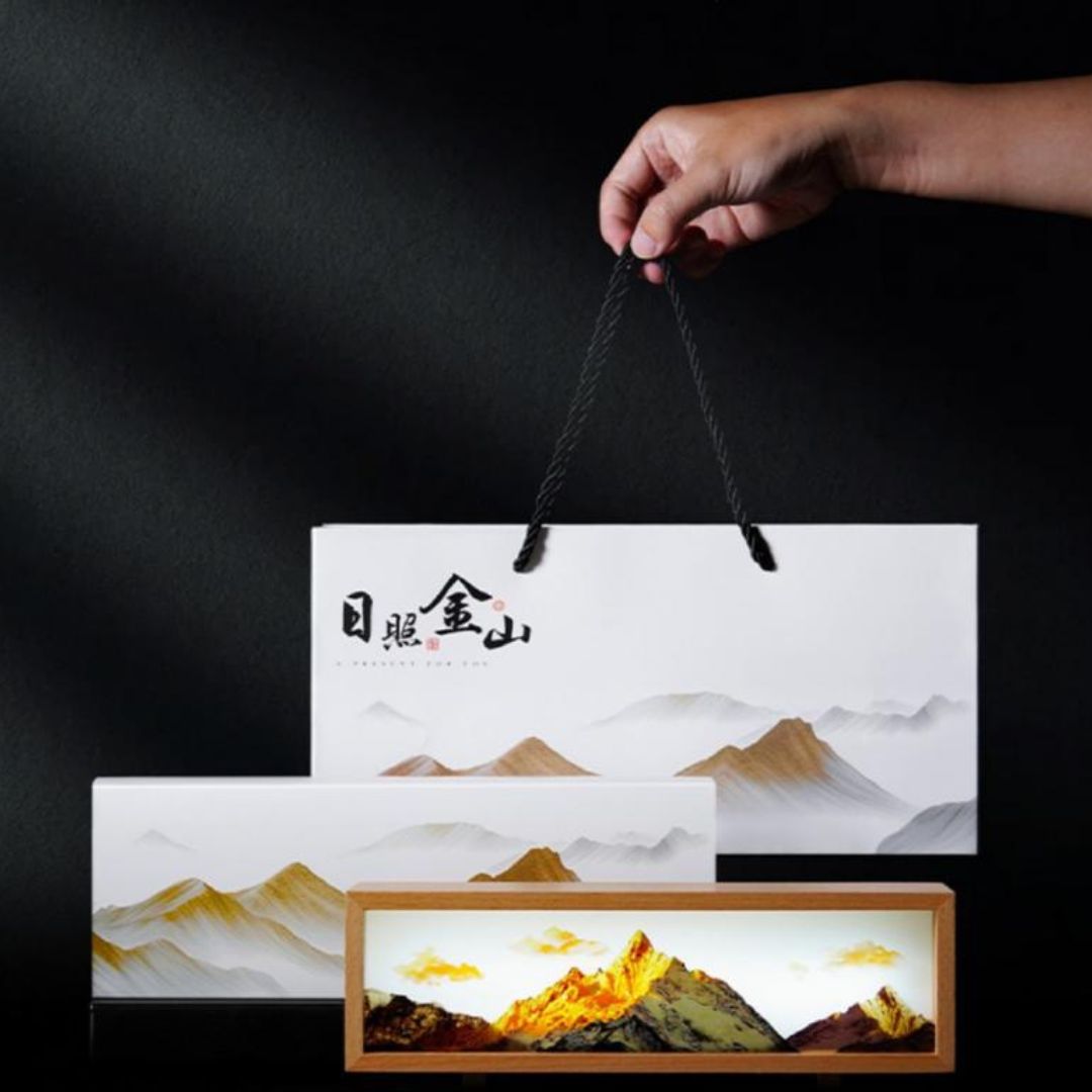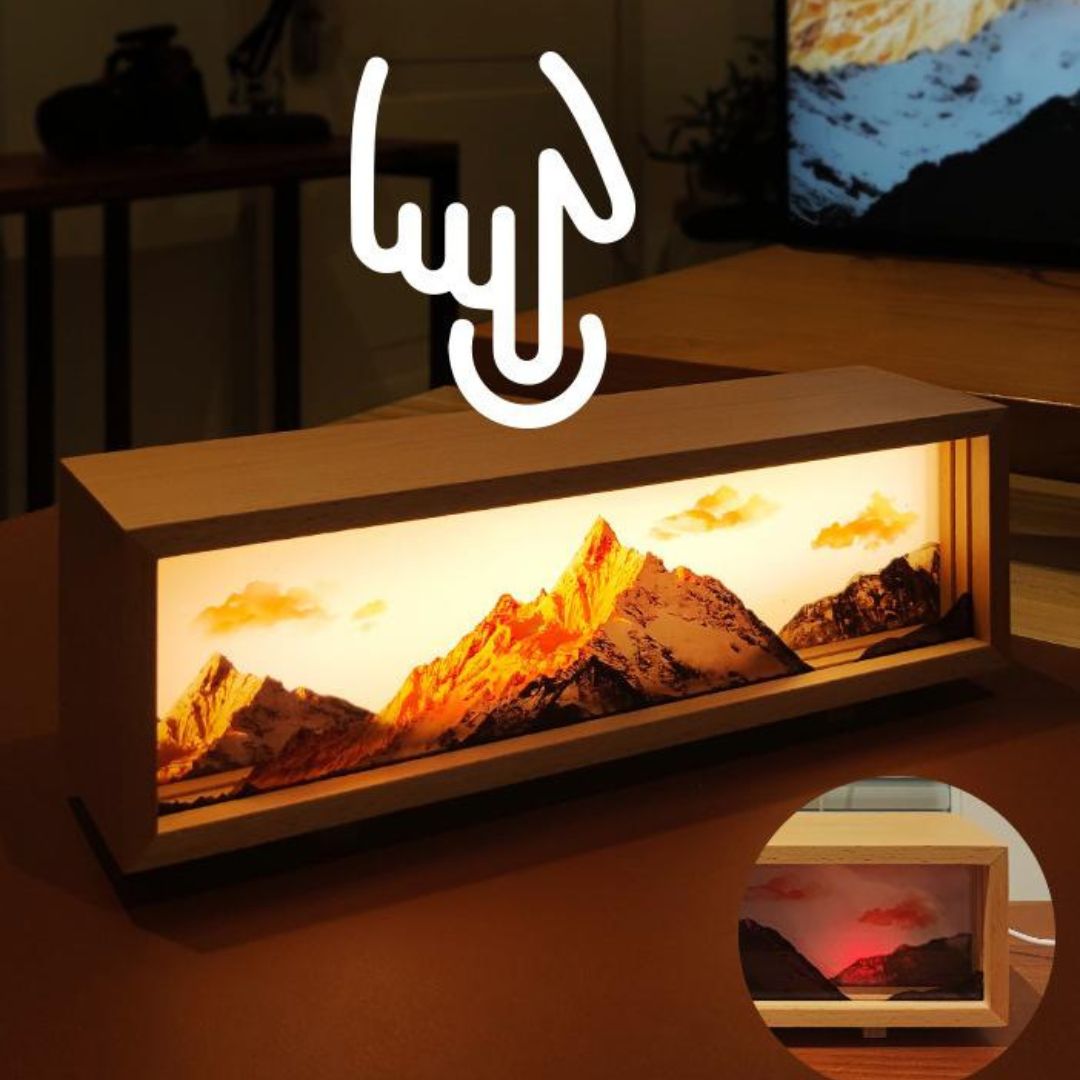 Chiếc đèn bàn khung gỗ tranh phong cảnh được thiết kế với dáng hình chữ nhật dài, khung gỗ dày dặn và chắc chắn, mang tông màu trầm sang trọng, phù hợp với nhiều phong cách nội thất. Điểm đặc biệt của sản phẩm nằm ở phần tranh phong cảnh bên trong khung, mô phỏng hình ảnh núi non hùng vĩ và mây trời lãng đãng. Khi ánh sáng được bật lên, từng chi tiết như ngọn núi, đỉnh đồi hay áng mây dường như trở nên sống động, tạo nên hiệu ứng thị giác như một bức tranh 3D chân thực ngay trong không gian của bạn.