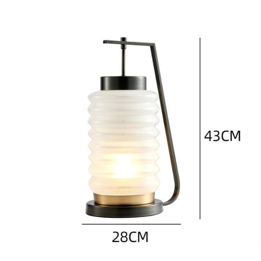 Phía trên thân đèn bàn thuỷ tinh gợn sóng là nắp kim loại màu đen dạng tròn, được gia công tỉ mỉ với bề mặt lì sang trọng. Chính yếu tố này tạo nên sự tương phản tinh tế giữa chất liệu cứng cáp của kim loại và sự mềm mại của thủy tinh gợn sóng. Nắp đèn nối với tay đèn bằng thanh trụ thẳng, cố định chắc chắn nhưng vẫn đảm bảo tính thẩm mỹ. Thiết kế này mô phỏng dáng dấp của một chiếc đèn lồng hiện đại – quen thuộc nhưng đầy nét mới mẻ.