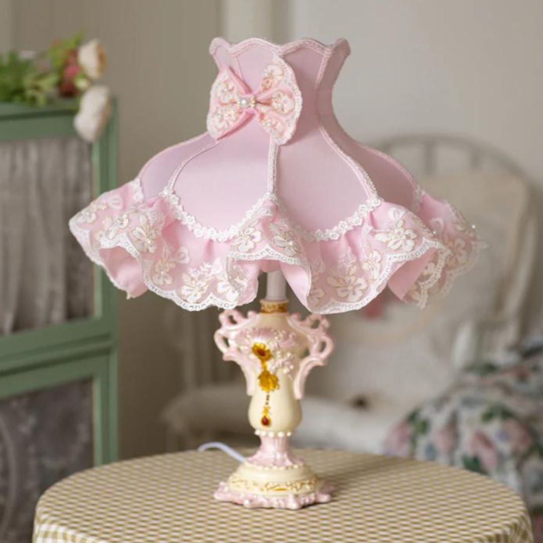 Đèn bàn vải ren nơ hồng là mẫu đèn bàn phong cách cổ tích mang cảm hứng từ trang phục của các nàng công chúa châu Âu thế kỷ 18–19. Với phom dáng uốn lượn mềm mại, họa tiết thêu tay hoa lá và chiếc nơ to bản được đính khéo léo ở phần chao đèn, mẫu đèn này mang lại cảm giác dịu dàng, ngọt ngào và vô cùng nữ tính.