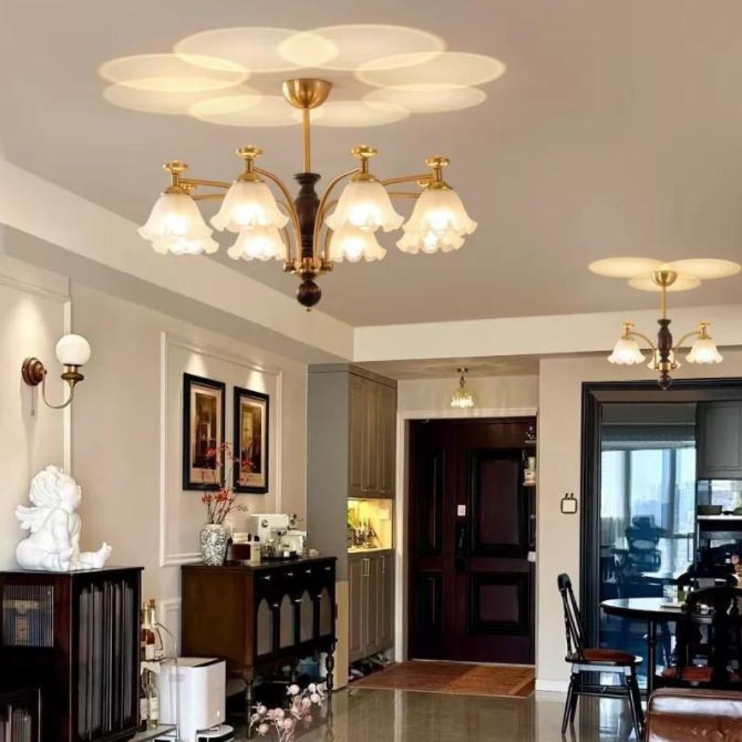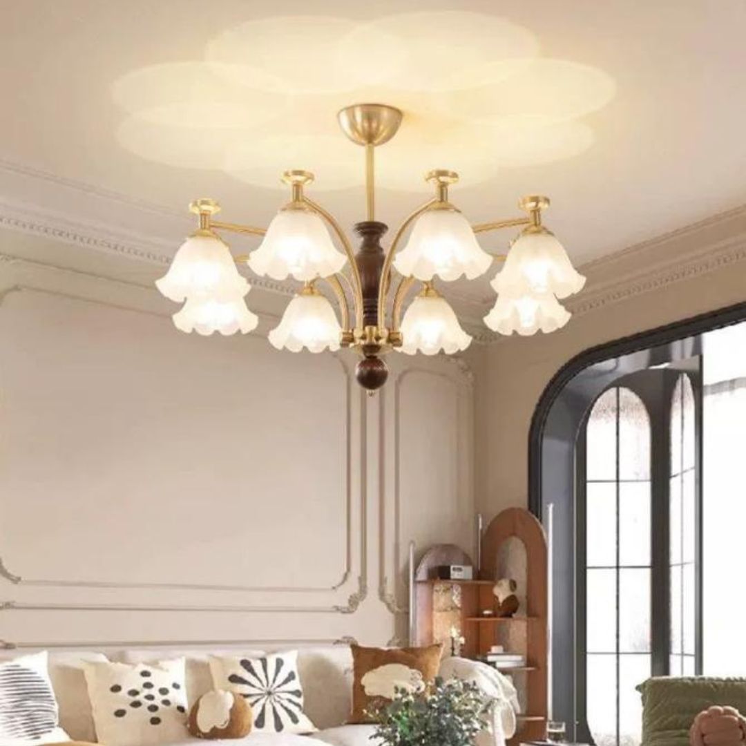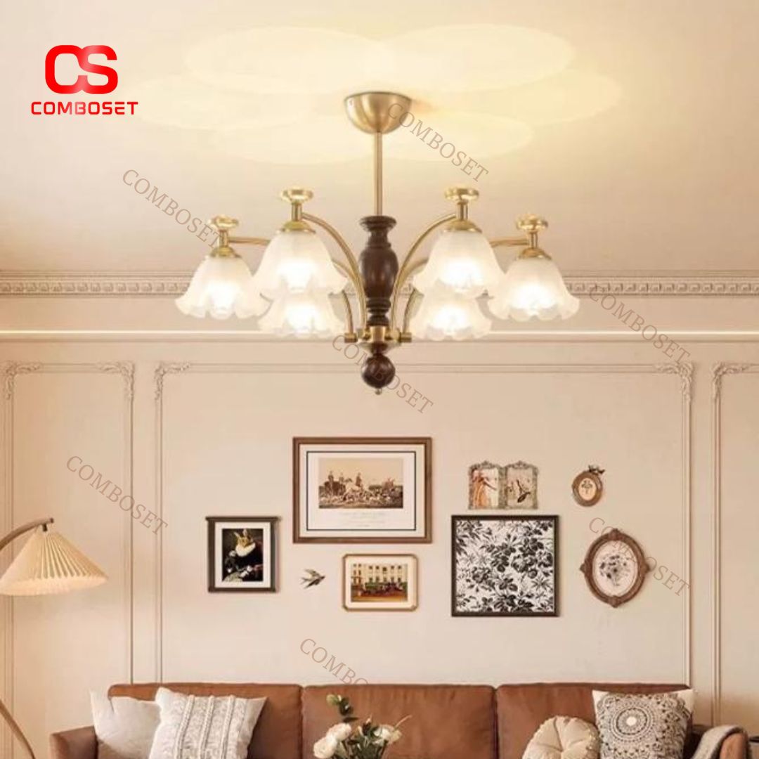 Đèn chùm 6 chao hoa thủy tinh mang trong mình tinh thần của phong cách cổ điển sang trọng thông qua sự kết hợp khéo léo giữa các chất liệu như kim loại màu đồng giả cổ, trục đèn sẫm màu giả gỗ và các chao đèn thủy tinh tạo hình bông hoa mềm mại. Sự phối hợp này tạo nên tổng thể đậm chất hoài cổ, gợi cảm giác ấm cúng, trang nhã và đầy tính nghệ thuật. Mẫu đèn này đặc biệt lý tưởng cho các không gian nội thất mang phong cách cổ điển, tân cổ điển hoặc vintage, giúp nâng tầm không gian sống một cách tinh tế và đẳng cấp.