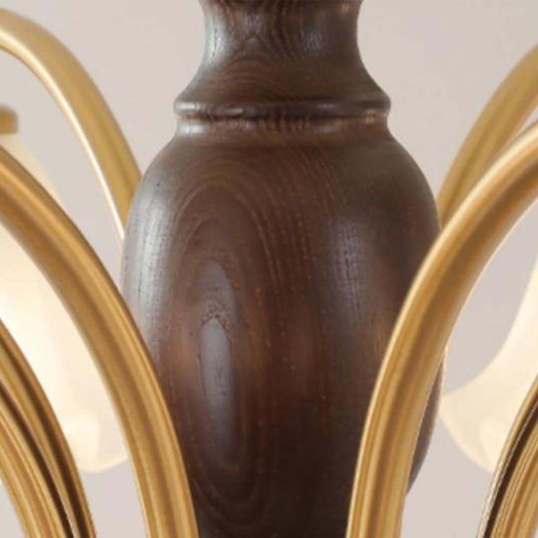 Phần trục đèn được tạo hình mô phỏng chất liệu gỗ tự nhiên, được xử lý kỹ lưỡng và phủ sơn PU bảo vệ. Nhờ lớp phủ này, đèn chùm 6 chao hoa thủy tinh không chỉ tăng cường khả năng chống mối mọt mà còn giữ màu bền lâu, giúp tổng thể đèn luôn như mới sau nhiều năm sử dụng.