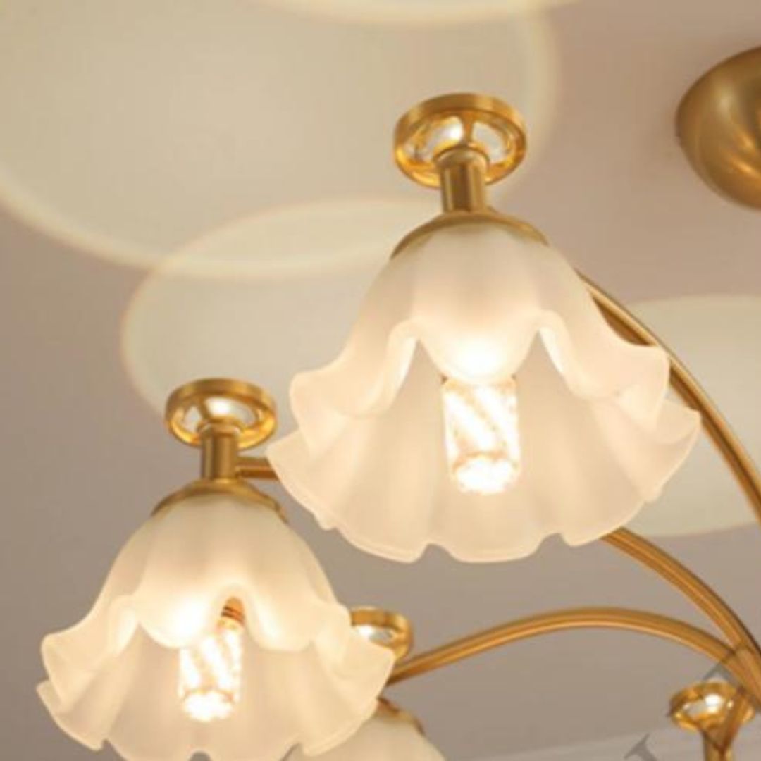 Không chỉ dừng lại ở vai trò chiếu sáng thông thường, đèn còn mang đến trải nghiệm thị giác độc đáo nhờ thiết kế chao hoa bằng thủy tinh mờ dày dặn. Khi ánh sáng được bật lên, các chao thủy tinh phản chiếu ánh sáng lên trần nhà, tạo thành hình cánh hoa lung linh – một hiệu ứng vừa nhẹ nhàng vừa cuốn hút. Đây là điểm nhấn khác biệt giúp đèn chùm 6 chao hoa thủy tinh trở nên nổi bật hơn so với các loại đèn chùm truyền thống.