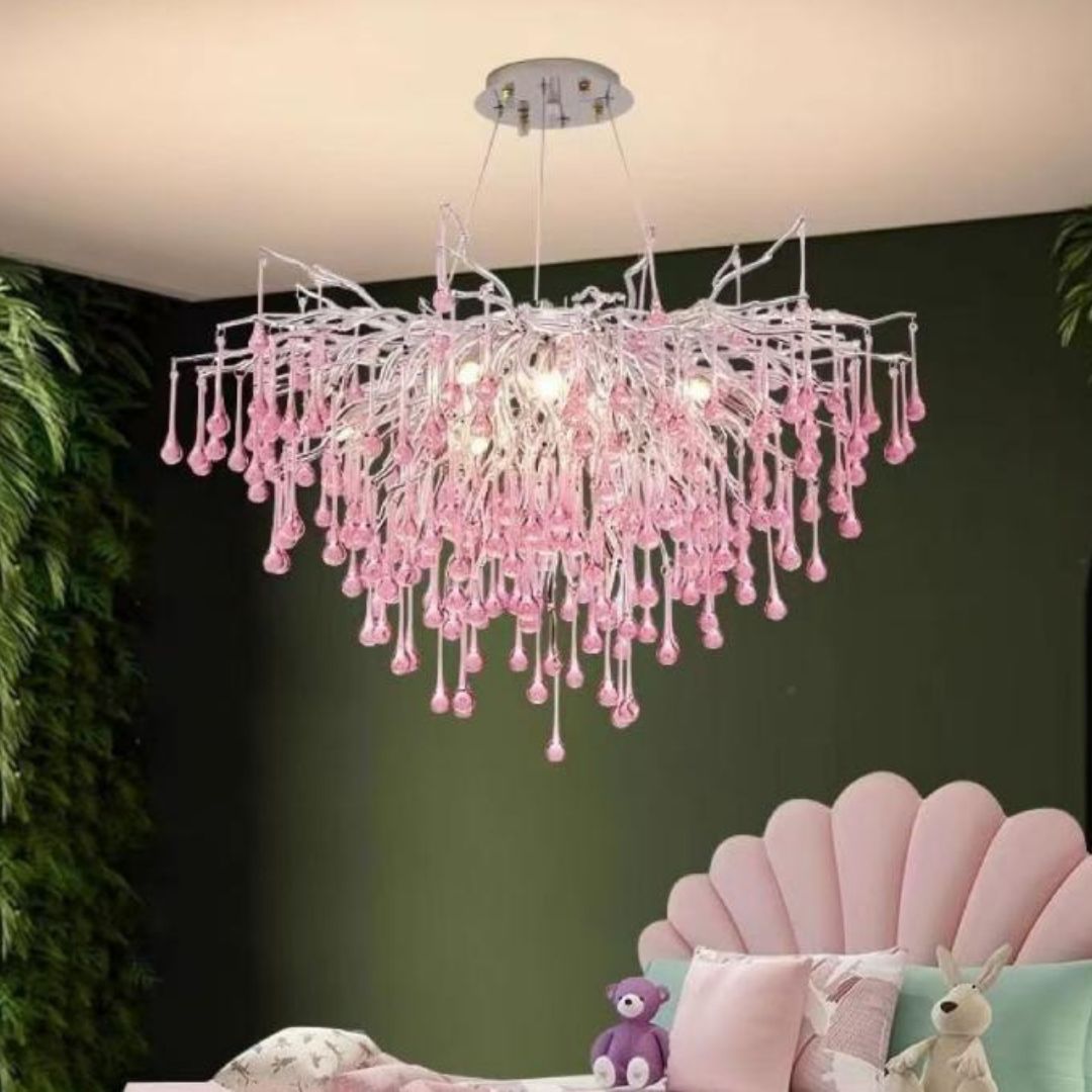 Đèn chùm giọt nước hồng đặc biệt phù hợp với phòng ngủ nhờ ánh sáng dịu nhẹ và thiết kế mềm mại. Màu hồng pastel giúp không gian trở nên nhẹ nhàng, tạo cảm giác thư giãn sau một ngày dài. Đây là lựa chọn lý tưởng cho những ai yêu thích phong cách nữ tính.
