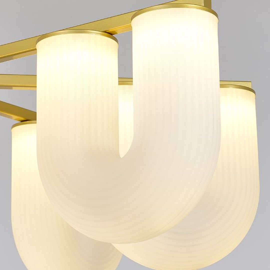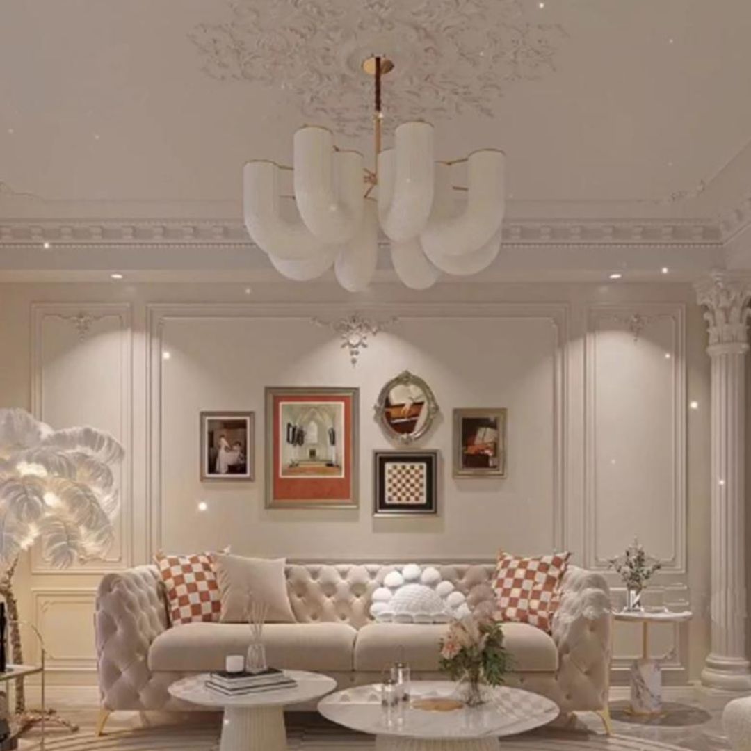 Chiếc đèn chùm hình chữ U có thiết kế ấn tượng với chao đèn bằng thủy tinh hoặc nhựa trắng mờ uốn cong mềm mại thành hình chữ U, bao quanh khung kim loại chắc chắn. Khi bật sáng, ánh sáng vàng dịu lan tỏa qua lớp chao mờ, tạo cảm giác ấm áp, sang trọng và vô cùng thư giãn. Các chao được bố trí cân đối theo vòng tròn, giúp ánh sáng tỏa đều khắp không gian mà không gây chói mắt. Tổng thể đèn toát lên vẻ hiện đại pha chút cổ điển, rất phù hợp với các phong cách nội thất như Luxury, Modern Classic hay Minimal Chic.