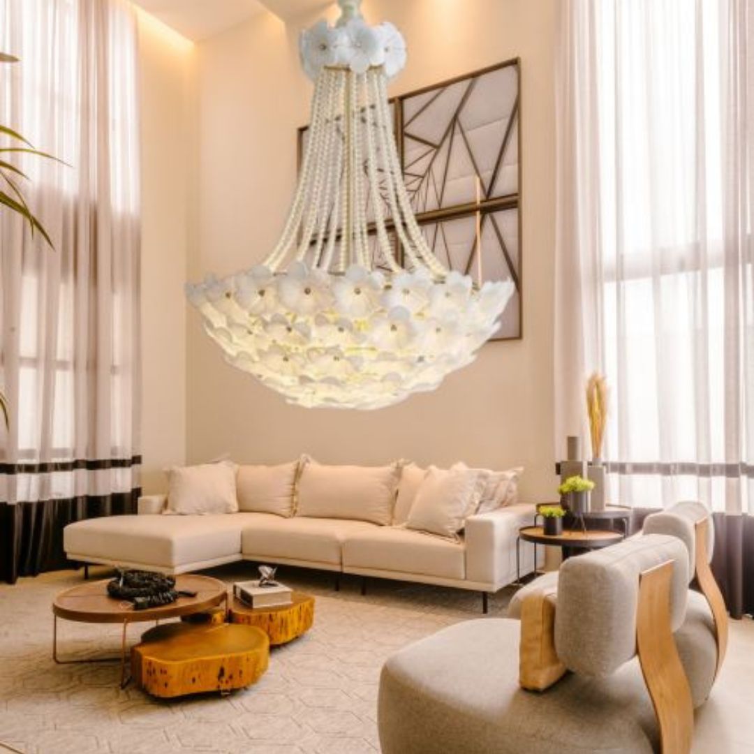 Phòng khách vốn là không gian trung tâm của ngôi nhà, nơi thể hiện rõ nhất gu thẩm mỹ và phong cách sống của gia chủ. Khi treo đèn chùm hoa trắng thanh lịch tại đây, chiếc đèn ngay lập tức trở thành tâm điểm thu hút mọi ánh nhìn. Ánh sáng dịu nhẹ lan tỏa qua từng bông hoa trắng giúp không gian thêm phần lung linh, đồng thời làm nổi bật bộ sofa, bàn trà hay những món đồ decor xung quanh. Sự kết hợp hài hòa này không chỉ mang lại cảm giác ấm áp, gần gũi mà còn khẳng định sự đẳng cấp, sang trọng của không gian tiếp khách.