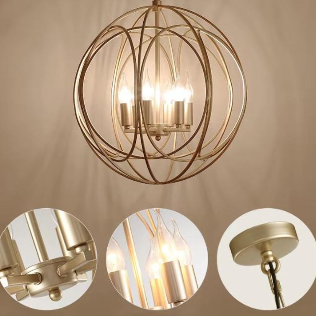 Trong hình, đèn chùm khung cầu kim loại thu hút ánh nhìn nhờ cấu trúc hình cầu với các thanh kim loại đan xen tinh xảo. Màu vàng ánh kim giúp sản phẩm trở nên nổi bật và quý phái hơn. Khi được lắp đặt trong không gian phòng khách hoặc sảnh lớn, đèn không chỉ cung cấp ánh sáng mà còn trở thành tâm điểm thu hút, thể hiện gu thẩm mỹ đẳng cấp của gia chủ.
