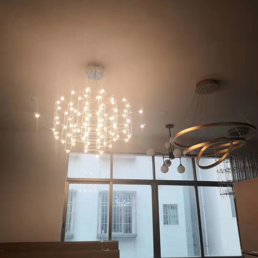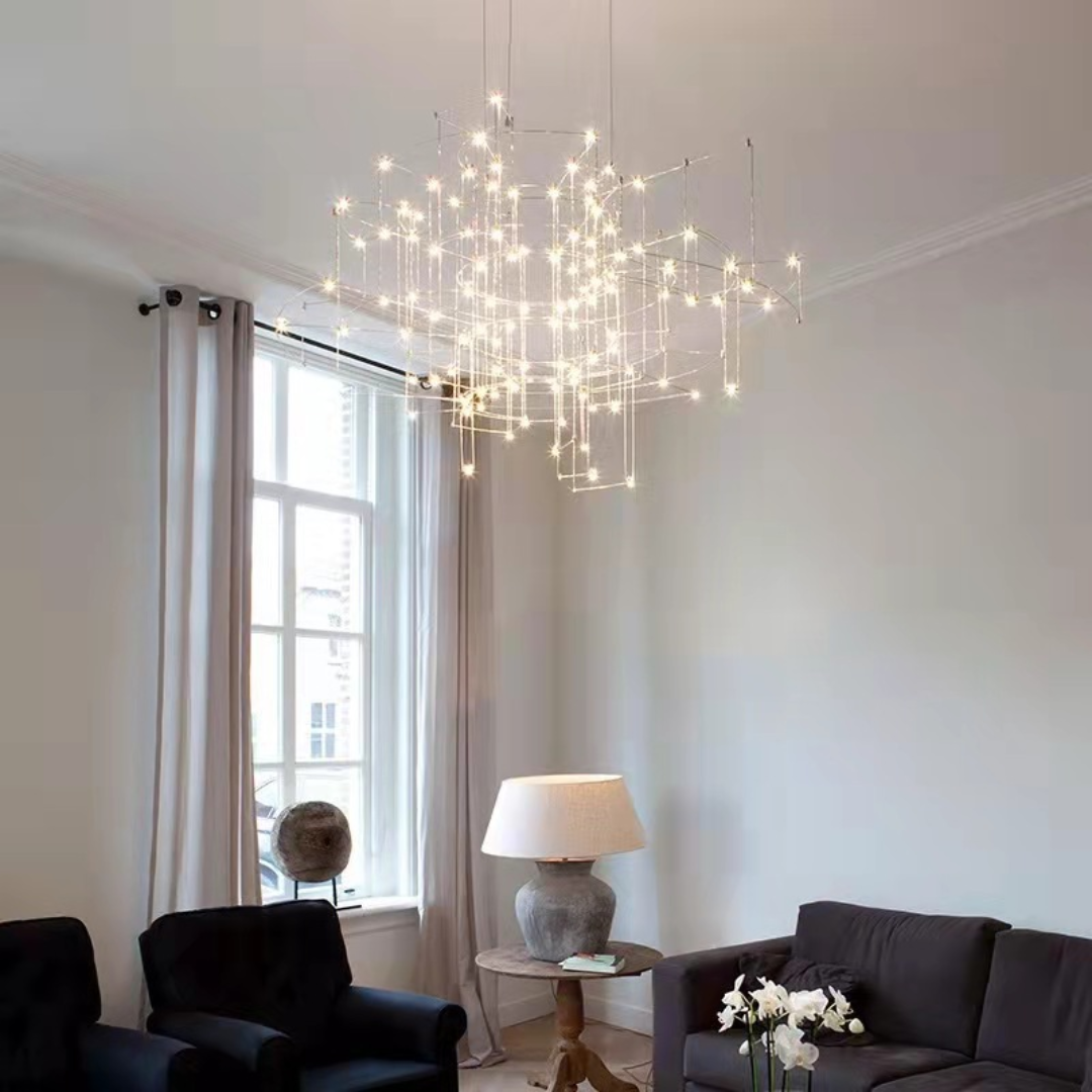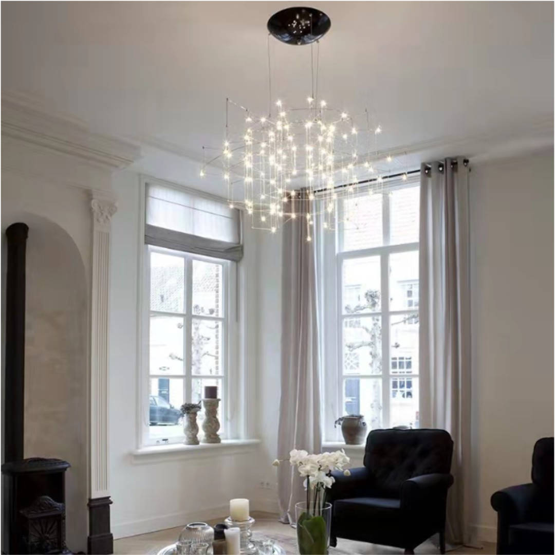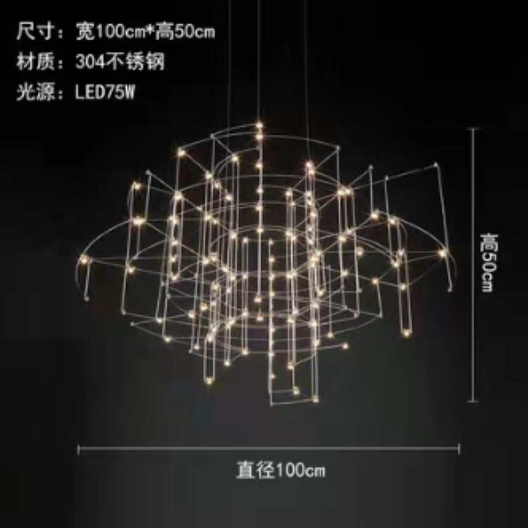 Đèn chùm led thép không gỉ này là thiết kế bầu trời trong không tưởng. Tưởng tượng bạn đang ngồi dưới một bầu trời đầy sao, nơi những vì sao lấp lánh chiếu sáng từ trên cao, tạo nên một không gian lung linh và huyền bí. Đèn chùm này tái hiện lại cảm giác đó bằng cách sử dụng các bóng đèn LED có ánh sáng vàng rực rỡ, mô phỏng ánh sáng của những vì sao đang phát sáng.