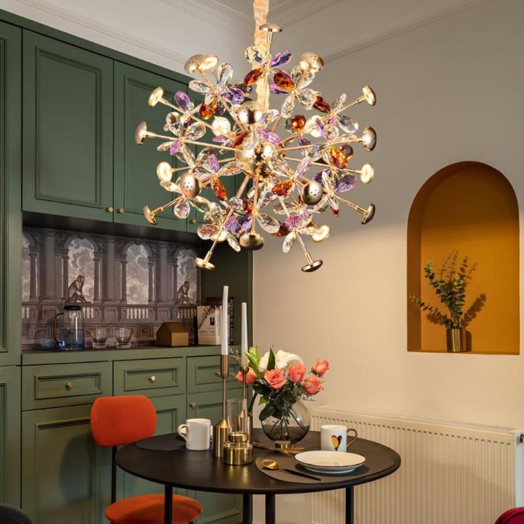 Trong phòng ăn, ánh sáng pha lê phản chiếu trên mặt bàn và dụng cụ ăn uống tạo nên khung cảnh lung linh, ấm cúng – lý tưởng cho những bữa ăn gia đình hoặc những buổi tiệc nhẹ nhàng, sang trọng. Không quá chói sáng nhưng đủ để tạo điểm nhấn, ánh sáng của đèn chùm pha lê hình hoa giúp các món ăn trở nên bắt mắt và hấp dẫn hơn, khiến bữa ăn trở thành một trải nghiệm thị giác đầy cảm xúc.