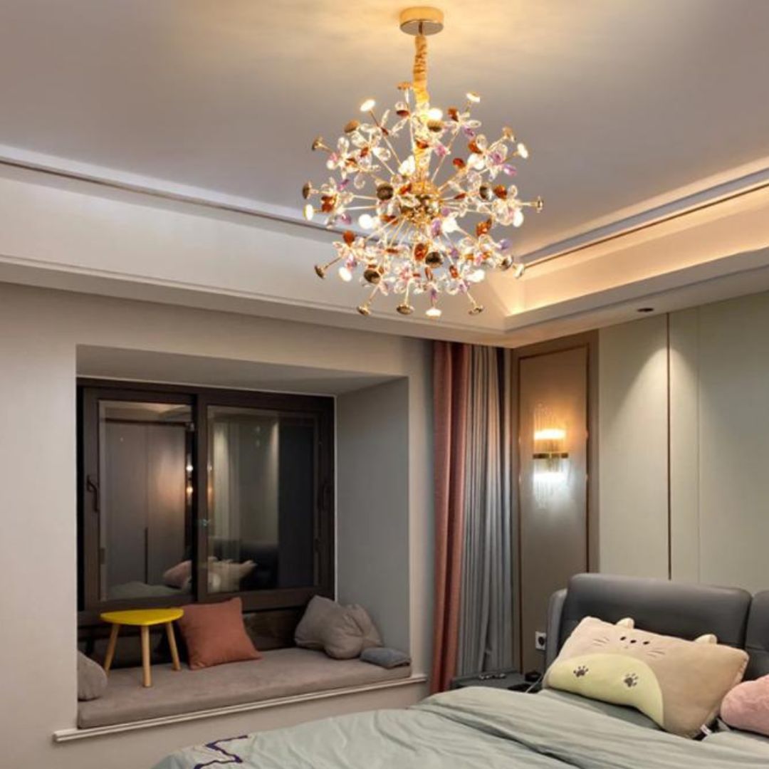 Với phòng ngủ, đèn chùm pha lê hình hoa lại thể hiện vẻ đẹp mềm mại và lãng mạn. Ánh sáng vàng nhẹ tỏa ra từ tâm đèn lan đều qua những cánh pha lê giúp không gian trở nên êm dịu, dễ chịu. Đây chính là lựa chọn hoàn hảo để tạo cảm giác thư giãn, giúp bạn dễ dàng thả lỏng và tận hưởng những phút giây nghỉ ngơi trọn vẹn sau một ngày dài.