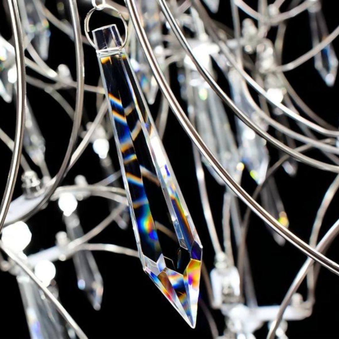 Thiết kế dạng rủ giúp ánh sáng được khuếch tán đa chiều, phản chiếu qua từng mảnh pha lê trong suốt. Khi đèn bật sáng, các chuỗi pha lê tạo nên hiệu ứng lung linh như thác ánh sáng, mang lại cảm giác sang trọng, tinh tế và đầy chiều sâu cho không gian.