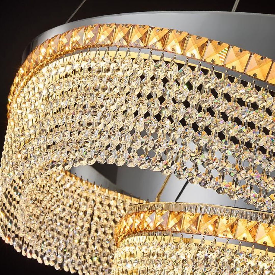 Tất cả những yếu tố ấy kết hợp hài hòa, khiến đèn chùm pha lê sóng đôi “thắp lên” vẻ sang trọng cho không gian sống. Ánh sáng phản chiếu qua lớp pha lê lấp lánh tựa kim tuyến, giúp căn phòng trở nên ấm cúng, lộng lẫy và đậm chất nghệ thuật. Khi bật sáng, ánh đèn phản chiếu qua hàng nghìn viên pha lê, tạo nên hiệu ứng lung linh như sóng nước chuyển động. Ánh vàng của viền kim loại hòa quyện cùng sắc phản xạ rực rỡ, giúp toàn bộ không gian trở nên rực rỡ và huyền ảo như một bức tranh ánh sáng ba chiều.