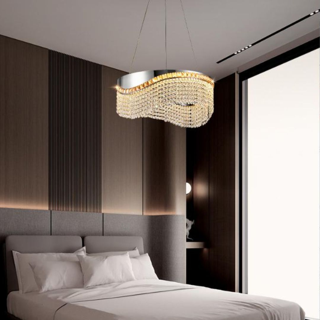Không gian sống đương đại không chỉ cần ánh sáng – mà còn cần cảm xúc. Chiếc đèn chùm pha lê sóng đôi trong hình là một tác phẩm nghệ thuật, nơi ánh sáng hòa quyện cùng chuyển động mềm mại của những đường cong uốn lượn, tạo nên một vũ điệu lấp lánh giữa không trung.