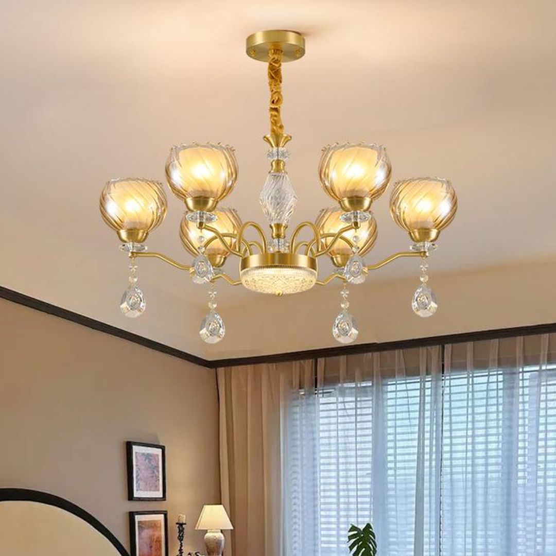 Phần chao đèn được chế tác từ thủy tinh cao cấp với họa tiết gân lượn xoáy, tái hiện hình dáng bông hoa đang hé nở. Ánh sáng xuyên qua lớp thủy tinh tạo hiệu ứng lung linh, mềm mại và đầy tính trang trí. Kiểu chao này mang lại cảm giác nhẹ nhàng, tinh khôi, khiến toàn bộ chiếc đèn chùm phòng khách pha lê trở thành một “tác phẩm nghệ thuật ánh sáng” ngay giữa trần nhà.