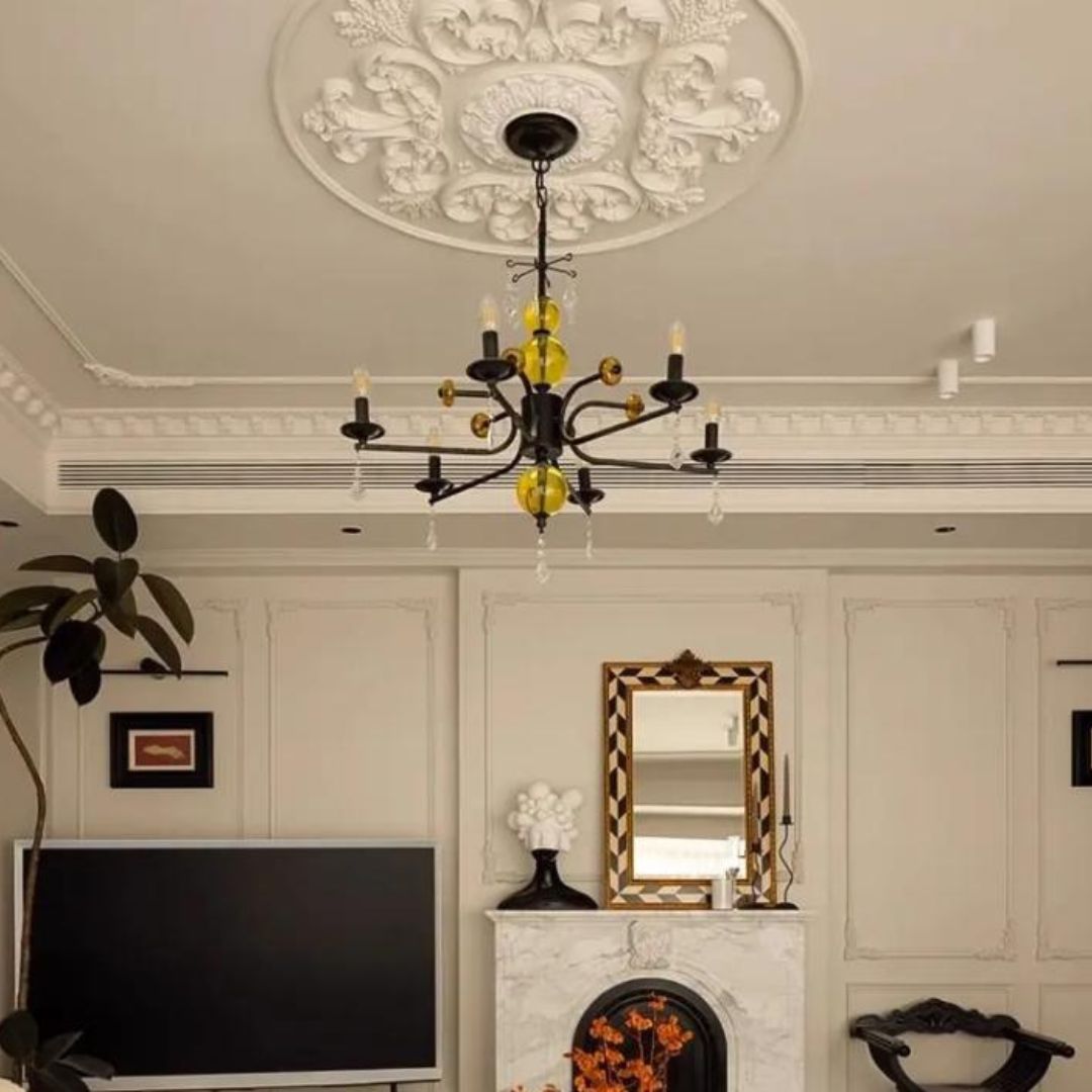 Trong những căn biệt thự hoặc nhà phố mang phong cách cổ điển – hiện đại pha retro, chiếc đèn chùm retro kim loại như một điểm nhấn hoàn hảo. Khi được treo giữa trần cao hoặc ngay trung tâm phòng khách, ánh sáng từ đèn lan tỏa khắp không gian, tạo nên vẻ đẹp vừa quyền quý vừa tinh tế. Các chi tiết kim loại đen và thủy tinh màu hổ phách hòa quyện với nội thất gỗ, da hoặc vải nhung, mang đến tổng thể sang trọng và đậm chất nghệ thuật.