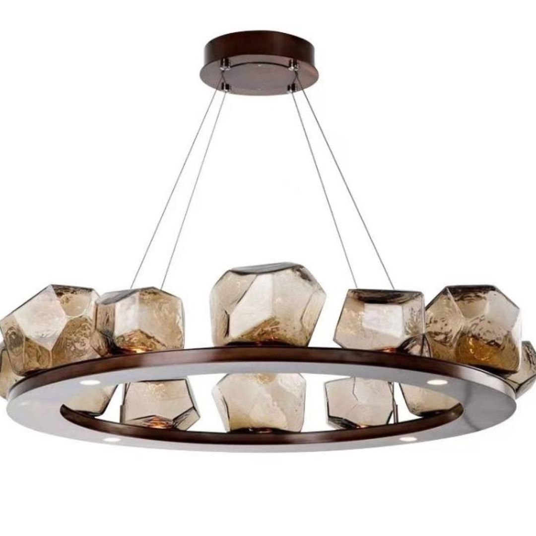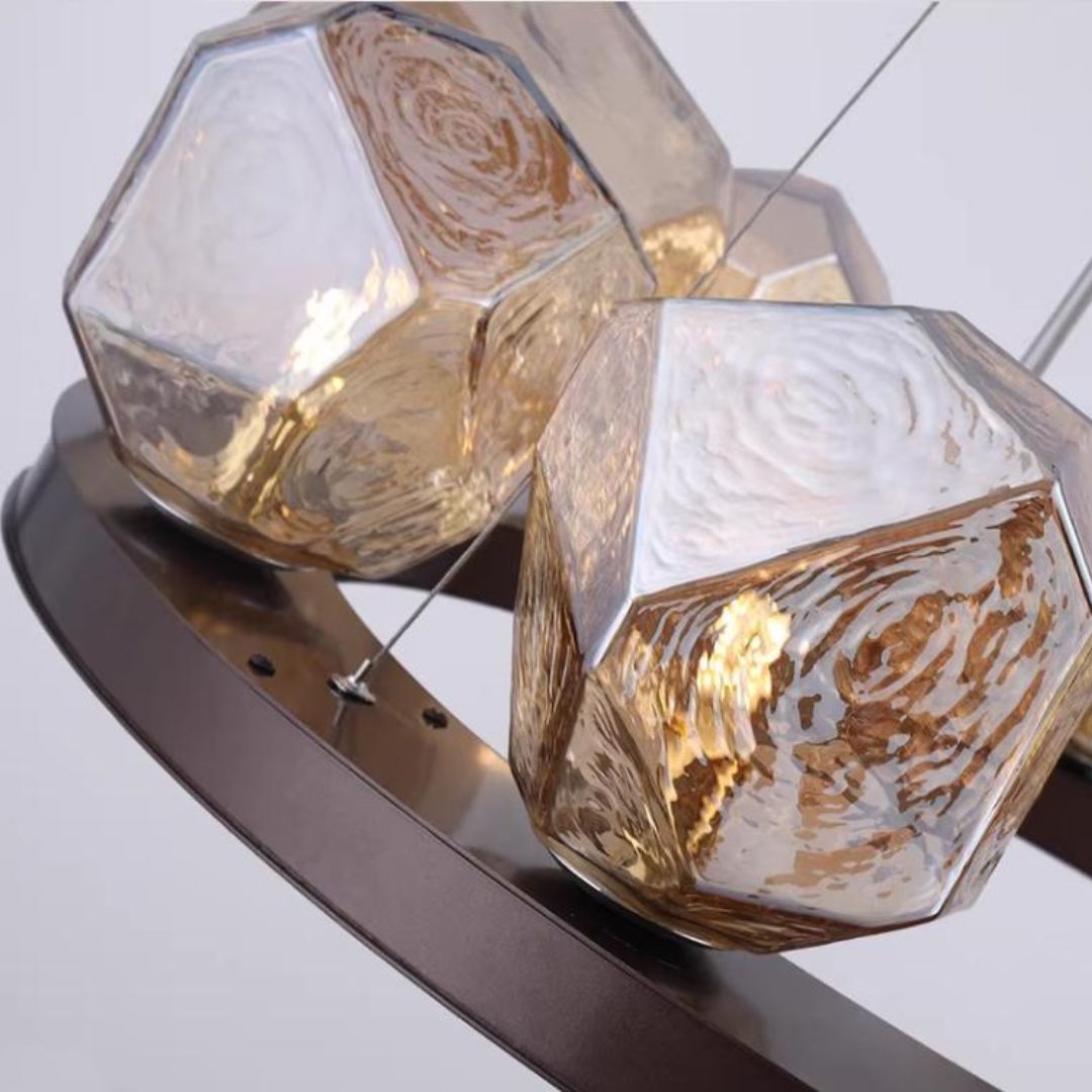 Phần chao của đèn chùm thuỷ tinh đa giác được làm từ thủy tinh cao cấp với độ trong suốt cao. Nhờ đó, ánh sáng có thể truyền qua một cách rõ nét, tạo hiệu ứng lung linh và sang trọng. Các mặt cắt đa giác giúp phân tán ánh sáng đều, hạn chế hiện tượng chói mắt.