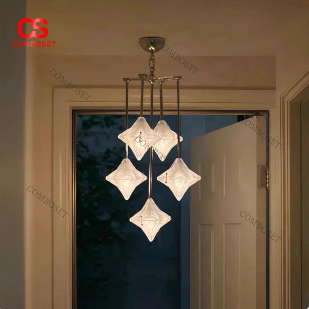 Đèn chùm thủy tinh hình học được thiết kế với cấu trúc độc đáo gồm nhiều khối thủy tinh trong mờ, được tạo hình theo phong cách hình học hiện đại. Mỗi chao đèn có dạng khối lập thể mềm mại, mang vẻ đẹp vừa khoa học vừa nghệ thuật. Ánh sáng khi đi qua lớp thủy tinh mờ tạo nên hiệu ứng lan tỏa dịu nhẹ, giúp không gian trở nên ấm áp và thanh lịch hơn.