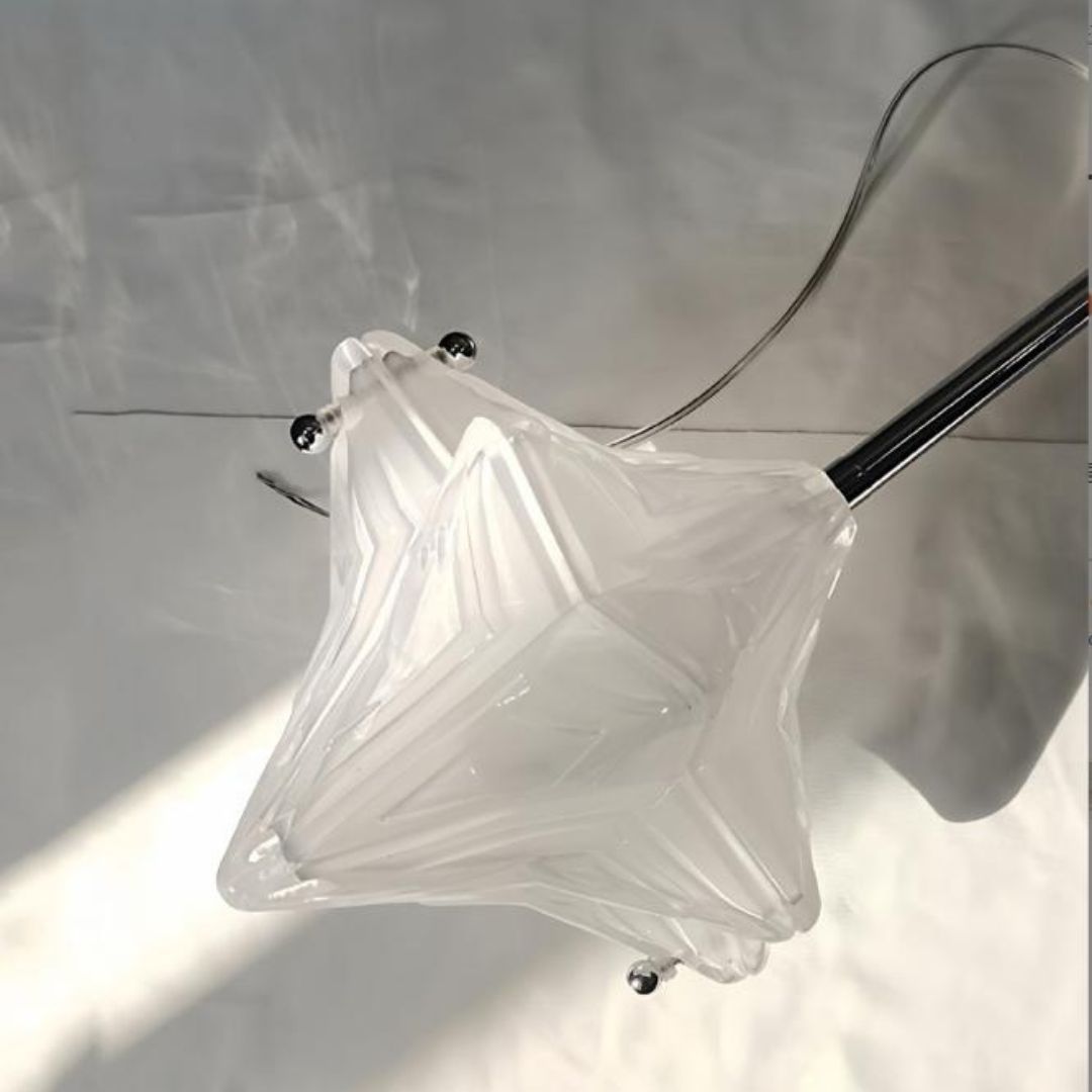 Phần chao làm từ thủy tinh dày trong mờ, vừa sang trọng vừa bền bỉ, tạo hiệu ứng ánh sáng mượt mà, dễ chịu cho mắt. Kết hợp cùng khung kim loại sơn mạ sáng bóng, sản phẩm vừa mang tính thẩm mỹ cao, vừa đảm bảo độ chắc chắn, hạn chế han gỉ trong thời gian dài. Mỗi mối nối, mỗi đường cong đều được gia công tỉ mỉ, thể hiện đẳng cấp của một sản phẩm trang trí cao cấp.