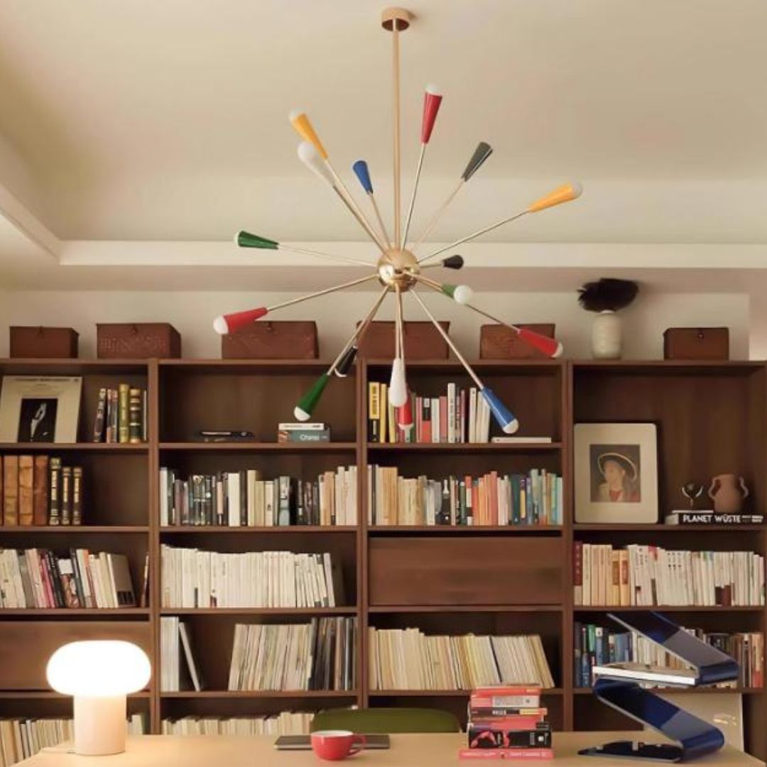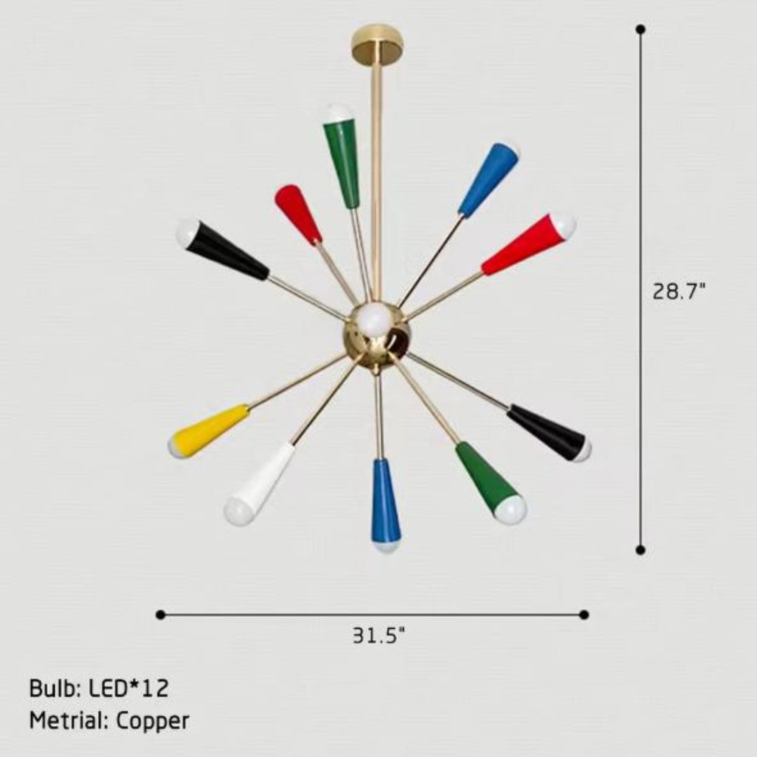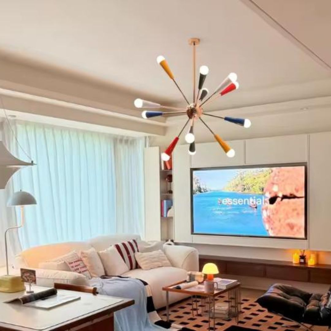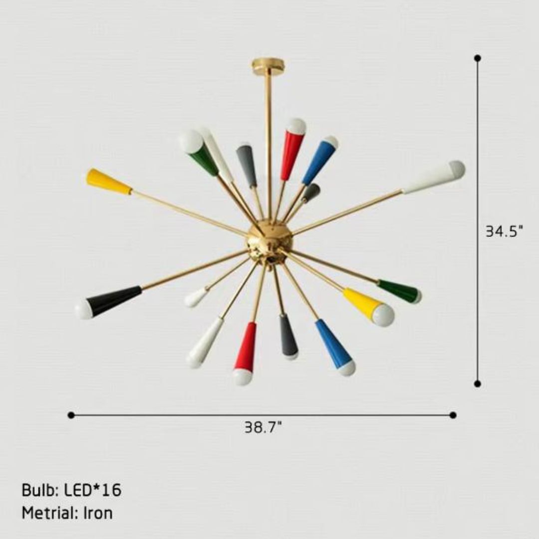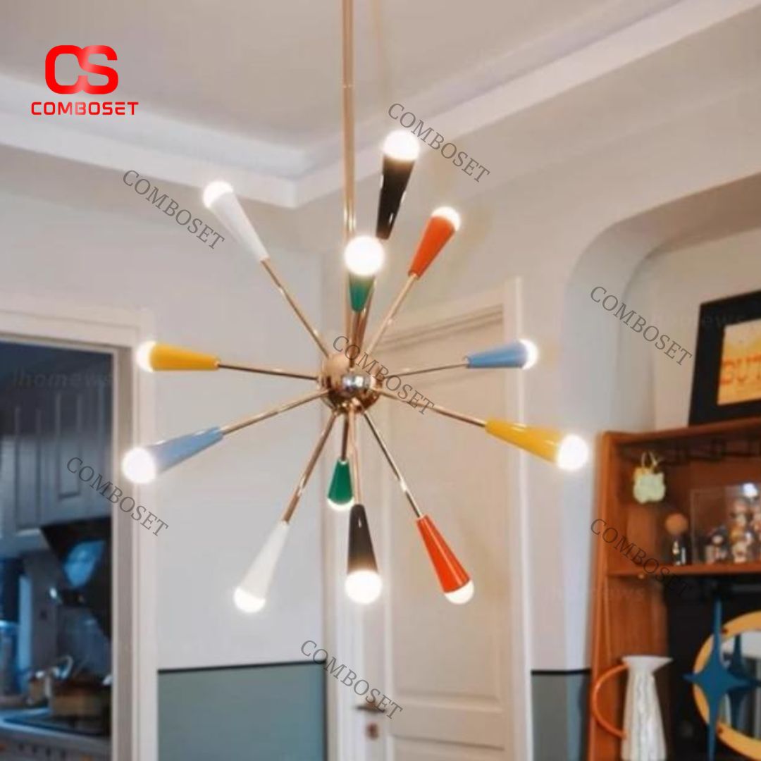 Mẫu đèn chùm trần đa sắc sở hữu kiểu dáng lấy cảm hứng từ những tia sáng lan tỏa, gợi liên tưởng đến pháo hoa rực rỡ hoặc mặt trời đang tỏa nắng. Từ phần thân trung tâm hình cầu, các thanh kim loại mảnh vươn dài ra nhiều hướng, tạo bố cục cân đối và hài hòa. Mỗi đầu đèn được thiết kế hình nón thuôn dài, kết hợp màu sắc đa dạng, mang đến vẻ đẹp sống động nhưng không hề rối mắt. Chính thiết kế này giúp chiếc đèn trở thành một tác phẩm trang trí nghệ thuật thực thụ trên trần nhà.