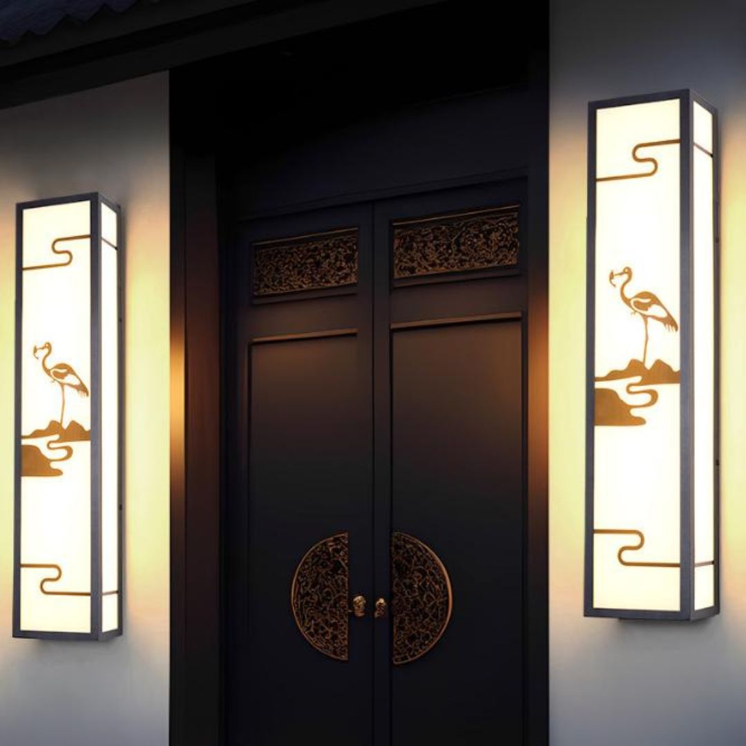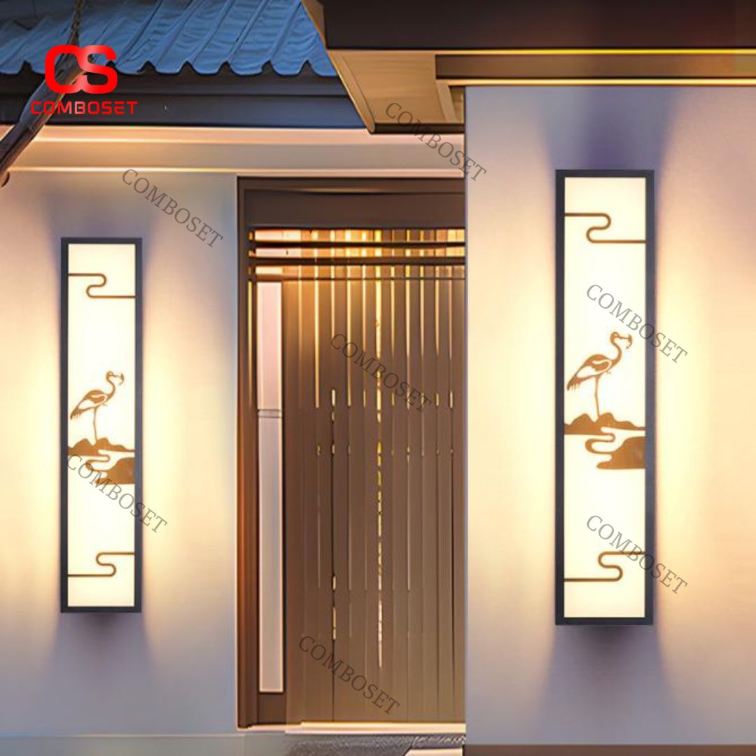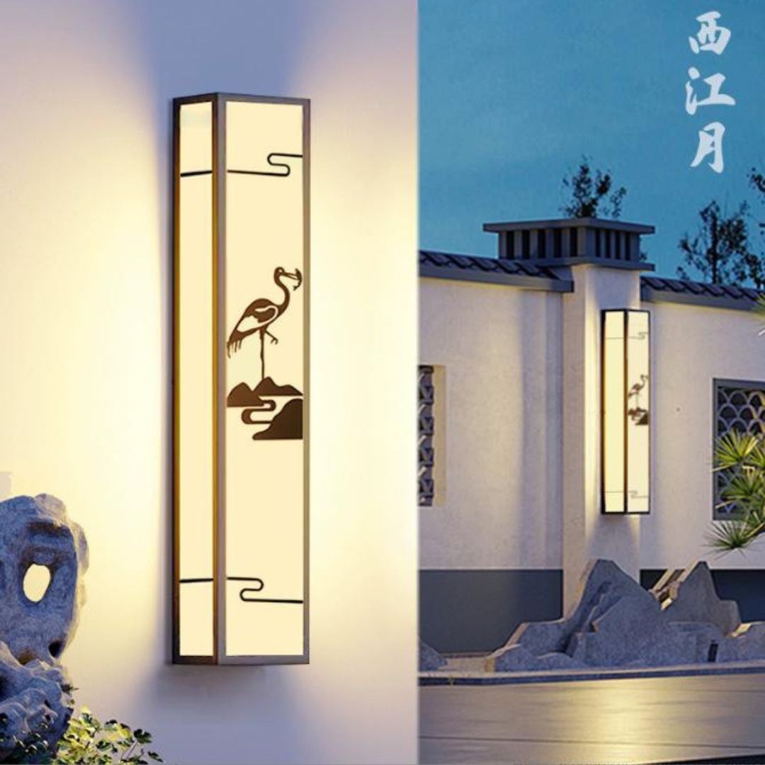 Điểm ấn tượng đầu tiên của đèn gắn tường hình hạc chính là dáng trụ dài hình chữ nhật đứng. Kiểu dáng này giúp đèn phù hợp lắp đặt ở nhiều vị trí như tường mặt tiền, hành lang, ban công hay lối đi. Thiết kế kéo dài theo chiều dọc còn giúp không gian trông cao và thoáng hơn, đặc biệt thích hợp với nhà phố hoặc biệt thự hiện đại.