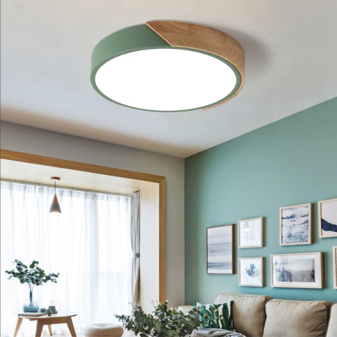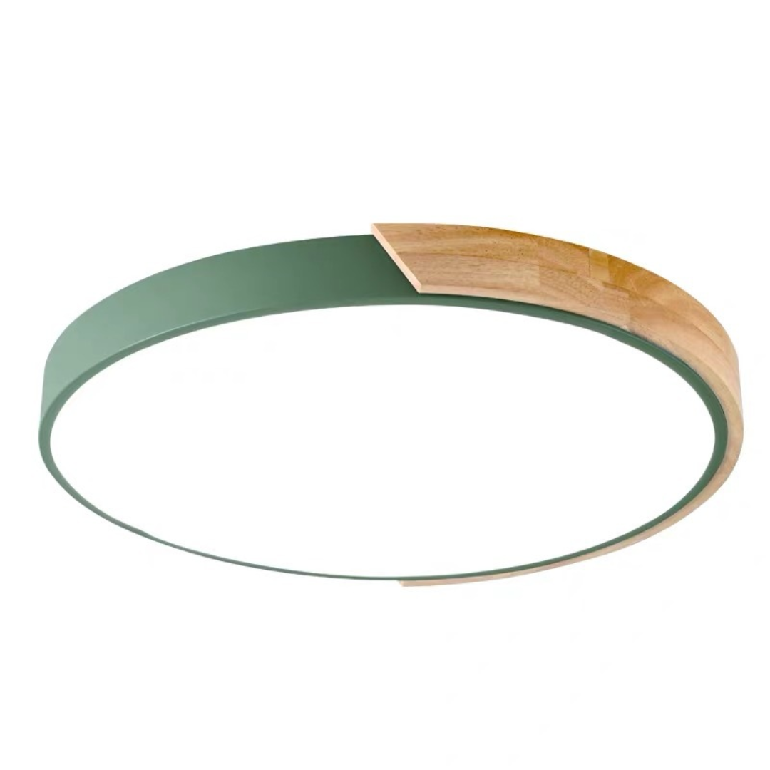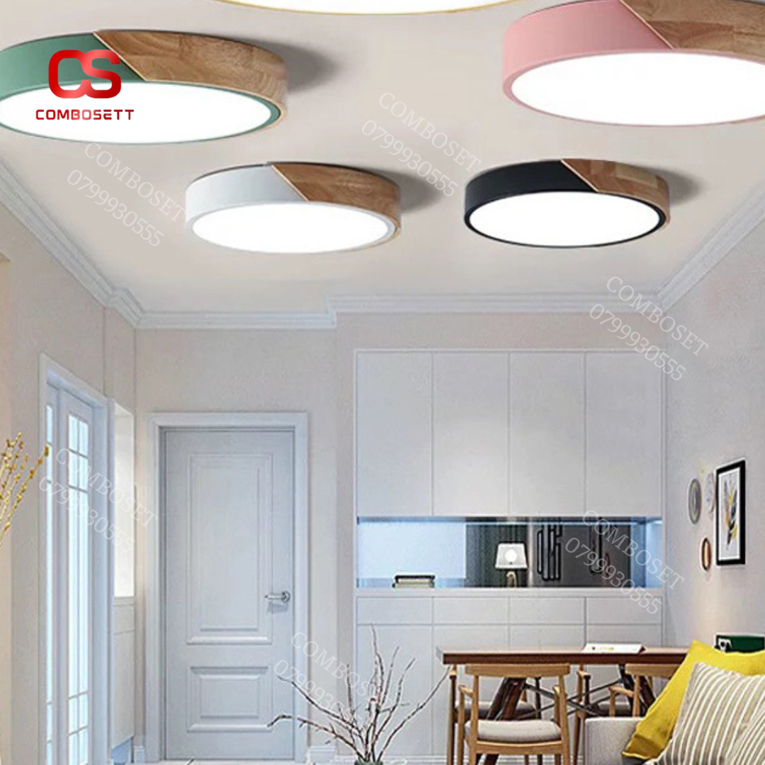 Đèn Led Ốp Trần Hình Tròn sở hữu thiết kế hình tròn đơn giản nhưng đầy thanh lịch, phù hợp với nhiều phong cách nội thất. Đèn được chia thành hai phần rõ rệt: nửa bán kính hình tròn được ghép từ gỗ tự nhiên, tạo cảm giác ấm cúng và gần gũi, trong khi nửa còn lại là phần thể hiện màu sắc của đèn. Sự kết hợp này không chỉ tạo ra vẻ đẹp thẩm mỹ mà còn mang lại cảm giác hài hòa cho không gian. Chất liệu gỗ tự nhiên không chỉ tăng cường tính thẩm mỹ mà còn giúp đèn dễ dàng hòa quyện với các yếu tố trang trí khác trong phòng.