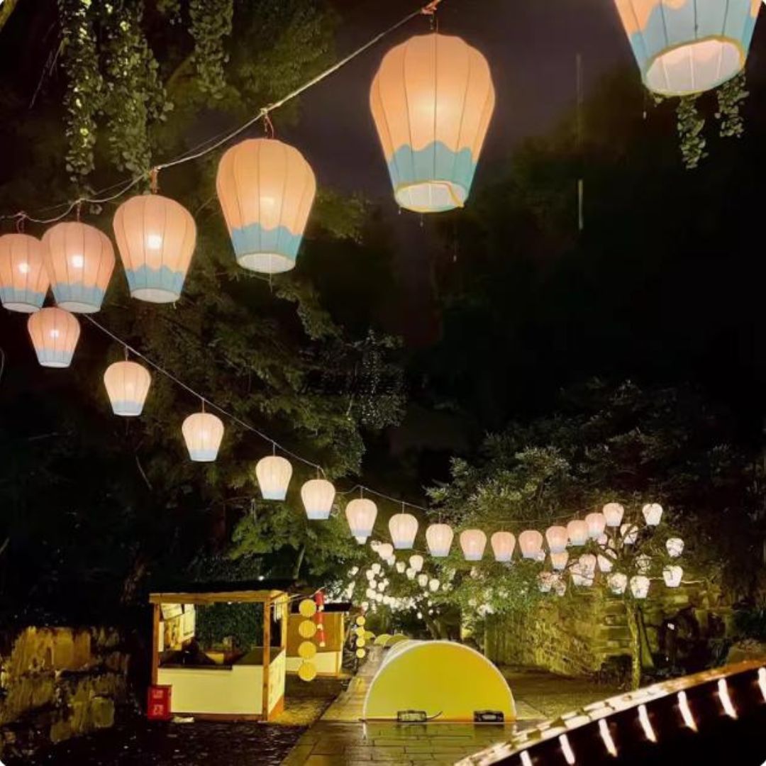 Ngoài nhà ở, đèn lồng treo ngoài trời còn được ứng dụng rộng rãi tại các khu vực công cộng như phố đi bộ, khu du lịch, quán café, nhà hàng trong dịp Tết. Khi được treo thành cụm, ánh sáng từ các đèn lồng hòa quyện với nhau, tạo nên khung cảnh lễ hội rực rỡ nhưng không quá chói, mang đậm tinh thần truyền thống Á Đông.