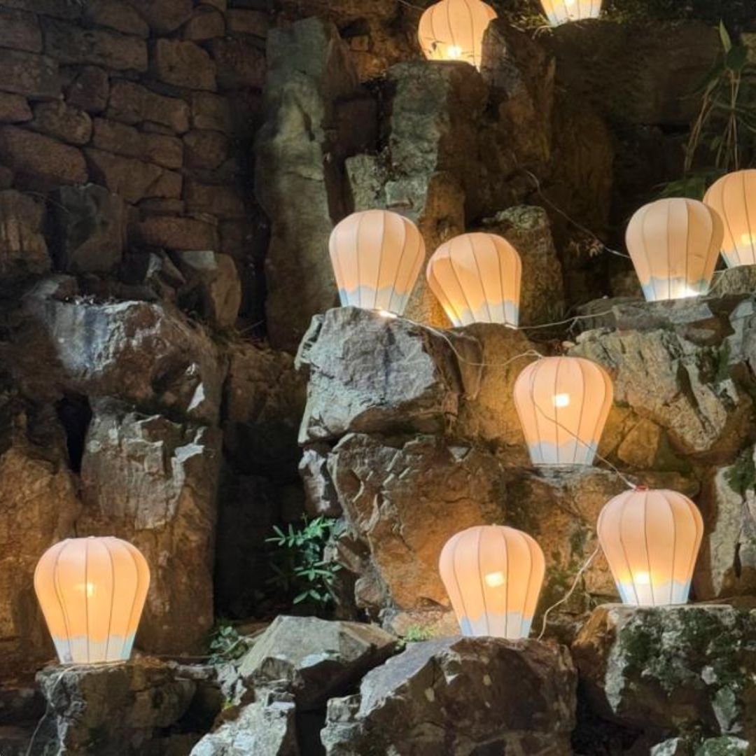 Phong cách lễ hội Á Đông trong thiết kế đèn lồng treo ngoài trời thể hiện rõ qua hình dáng mềm mại, cân đối và màu sắc trang nhã. Mẫu đèn trong hình mang dáng lồng truyền thống, được treo thành cụm trên cành cây, tạo hiệu ứng thị giác như những chiếc đèn hoa đăng lơ lửng giữa không gian xanh. Thiết kế này gợi nhớ đến các lễ hội đèn lồng cổ xưa tại Việt Nam, Trung Hoa hay Nhật Bản, nơi ánh sáng đóng vai trò kết nối con người với thiên nhiên.