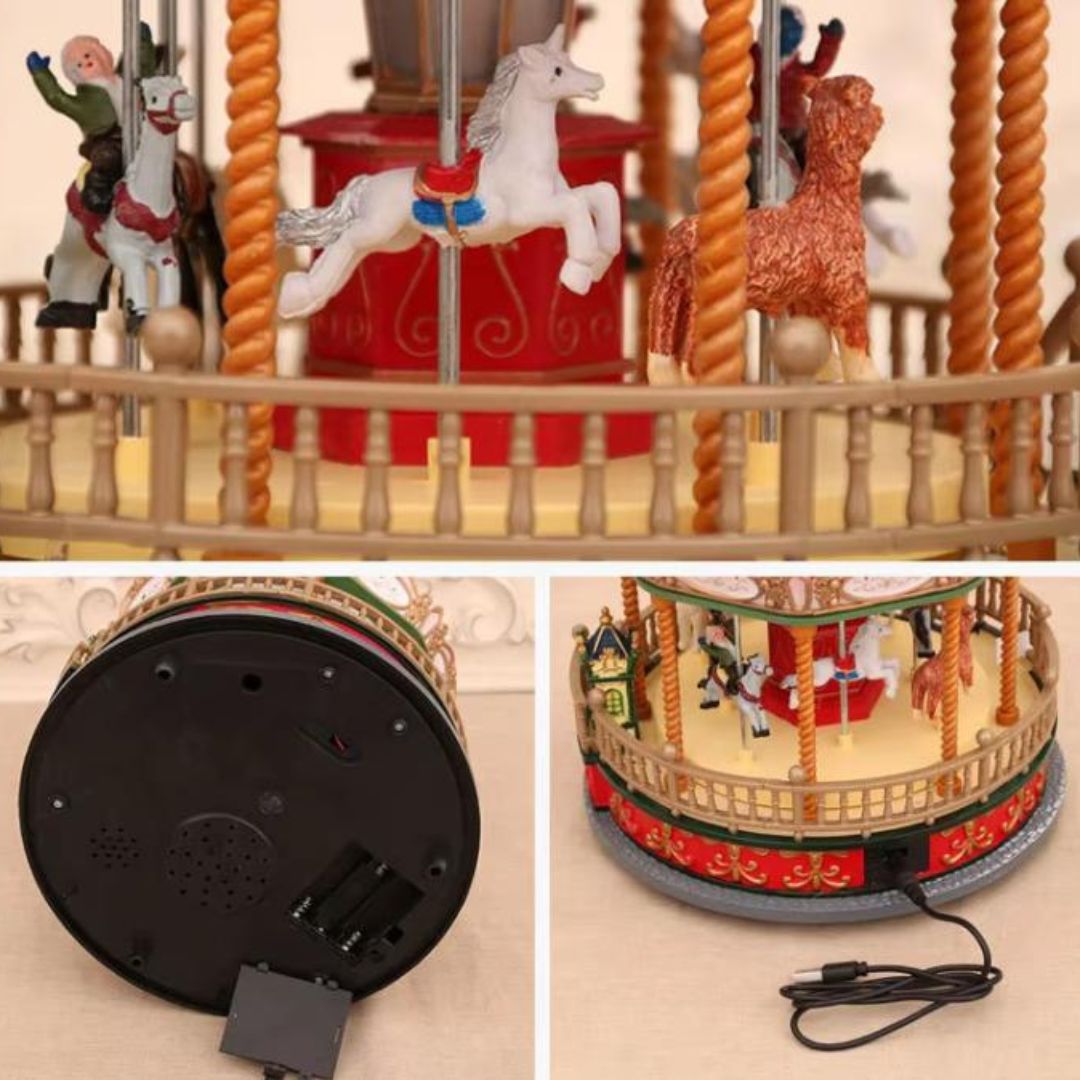 Đèn Noel vòng xoay ngựa được chế tác từ nhựa ABS cao cấp, mang lại cảm giác chắc chắn, bền bỉ nhưng vẫn giữ được nét thanh thoát, tinh tế. Toàn bộ phần khung và chi tiết được sơn tỉ mỉ bằng màu đỏ – trắng xen kẽ, tái hiện hoàn hảo hình ảnh vòng xoay ngựa cổ tích quen thuộc. Trên từng tầng của đèn là những chú ngựa mini nhiều màu, tạo nên khung cảnh sống động như một khu vui chơi thu nhỏ.