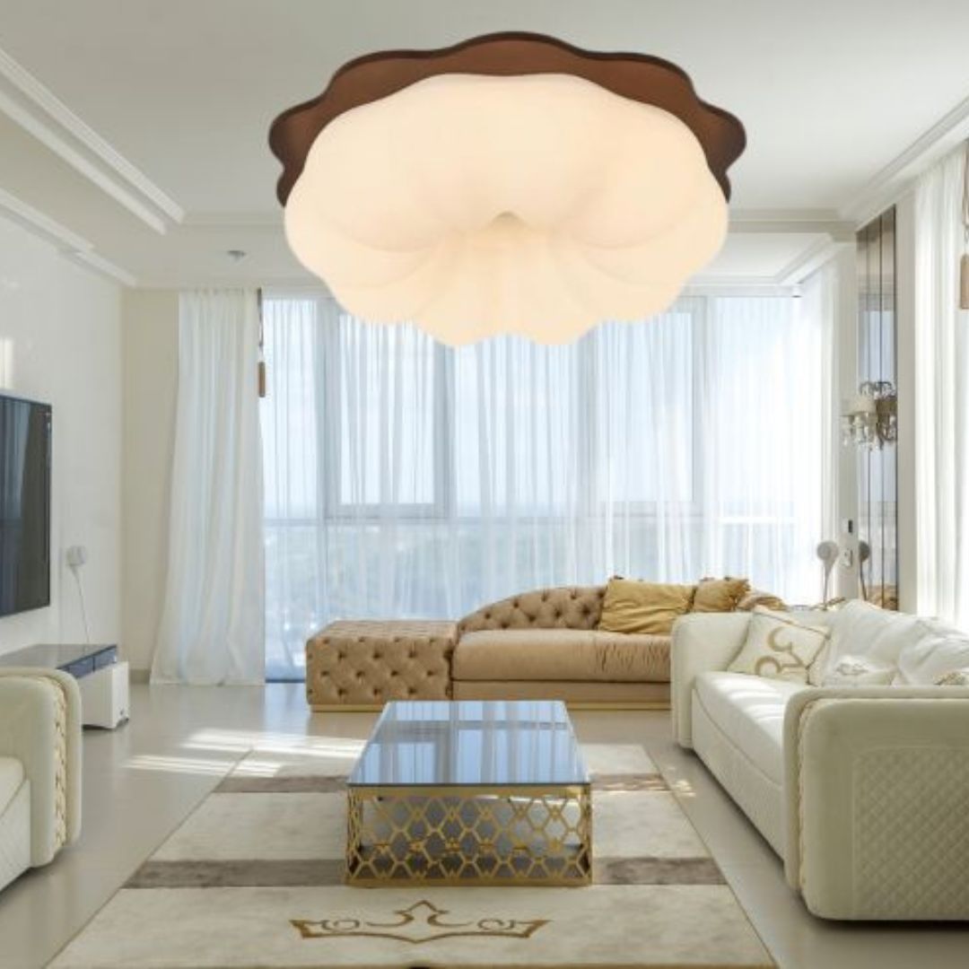 Điểm nhấn đặc biệt của mẫu đèn ốp trần gỗ này nằm ở phần chao đèn được tạo hình cách điệu theo hình ảnh đám mây bồng bềnh trên bầu trời. Các đường cong uốn lượn mềm mại, tinh tế tạo nên vẻ đẹp thanh thoát, nghệ thuật mà không hề gây cảm giác rối mắt hay nặng nề. Thiết kế này phù hợp với nhiều phong cách nội thất khác nhau như Nhật Bản, Bắc Âu hay phong cách tối giản hiện đại. Đây là lựa chọn hoàn hảo cho những ai yêu thích sự đơn giản nhưng vẫn muốn tạo điểm nhấn nghệ thuật độc đáo cho không gian sống.