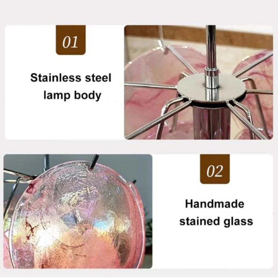 Điểm thu hút đầu tiên của đèn ốp trần thủy tinh màu sắc chính là tạo hình đặc biệt – những tấm thủy tinh được uốn cong như cánh lá, kết hợp thành khối tròn mềm mại. Mỗi phiến lá đều được nhuộm màu nhẹ nhàng với hiệu ứng chuyển sắc, khi bật đèn sẽ phản chiếu ánh sáng tạo nên bức tranh ánh sáng – màu sắc đầy cuốn hút.