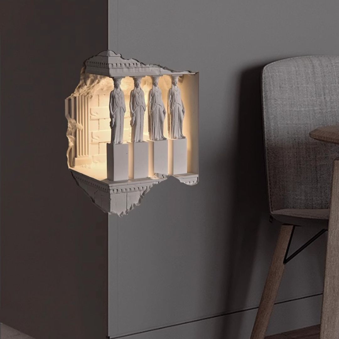 Đèn ốp tường thạch cao cảm ứng 120 độ là một sản phẩm hoàn hảo cho những không gian trang trí như hành lang, lối đi với thiết kế mang đậm dấu ấn thần thoại Hy Lạp cổ đại. Với hình ảnh bốn thiếu nữ trong trang phục Hy Lạp đứng cạnh nhau, chiếc đèn không chỉ là nguồn sáng mà còn là tác phẩm nghệ thuật độc đáo giúp không gian trở nên nổi bật và sang trọng hơn.