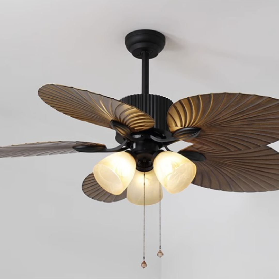 - Cánh Quạt Hình Chiếc Lá: Đèn quạt trần này nổi bật với năm cánh quạt được thiết kế hình chiếc lá, tạo ra một vẻ đẹp tự nhiên và tươi mới. Các cánh quạt không chỉ làm mát không khí hiệu quả mà còn trở thành một phần của trang trí, thêm vào đó là sự thanh thoát và tinh tế cho không gian.