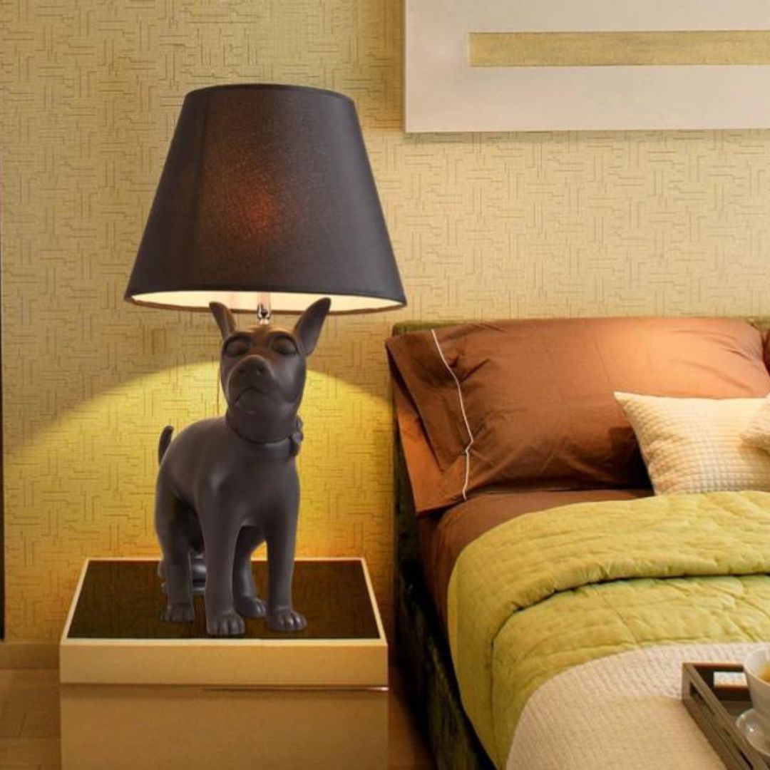 Màu đen là gam màu biểu trưng cho sự sang trọng, quyền lực và tính nghệ thuật cao. Khi được áp dụng cho đèn sàn decor hình chó, tông màu này giúp làm nổi bật đường nét điêu khắc và tạo chiều sâu cho sản phẩm. Dưới ánh sáng vàng ấm từ chụp đèn, màu đen trở nên mềm mại hơn, không hề nặng nề hay u tối.