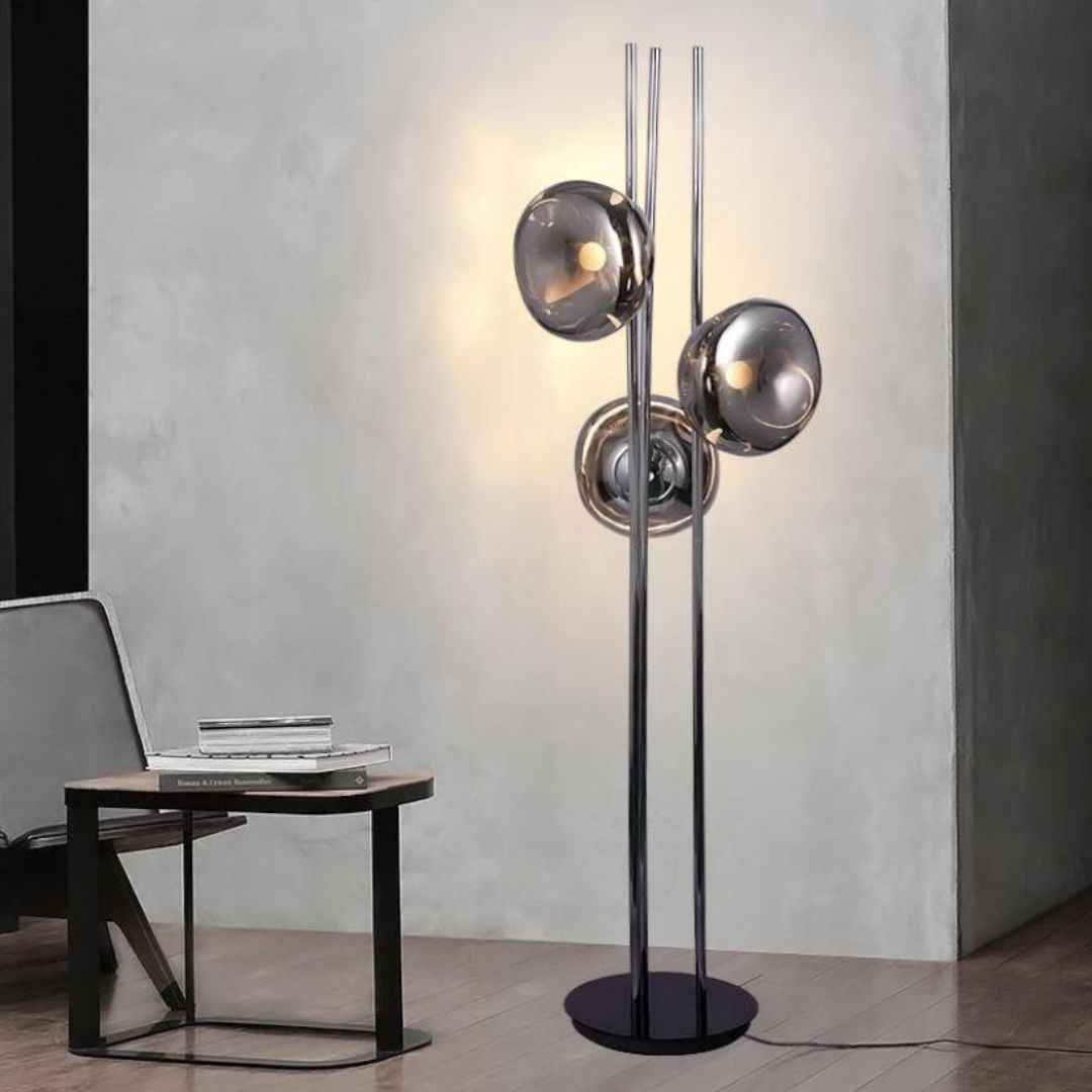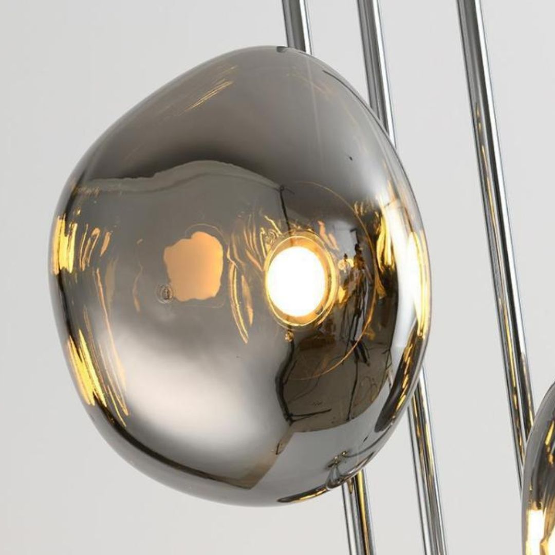 Thiết kế của đèn sàn kính màu tráng gương mang đậm dấu ấn phong cách Ý với sự tối giản nhưng đầy tinh tế. Các thanh kim loại thẳng đứng tạo nên cấu trúc vững chắc, trong khi những quả cầu kính được sắp xếp bất đối xứng tạo cảm giác tự do, nghệ thuật. Tổng thể chiếc đèn giống như một tác phẩm điêu khắc ánh sáng, phù hợp với xu hướng nội thất hiện đại và tối giản.