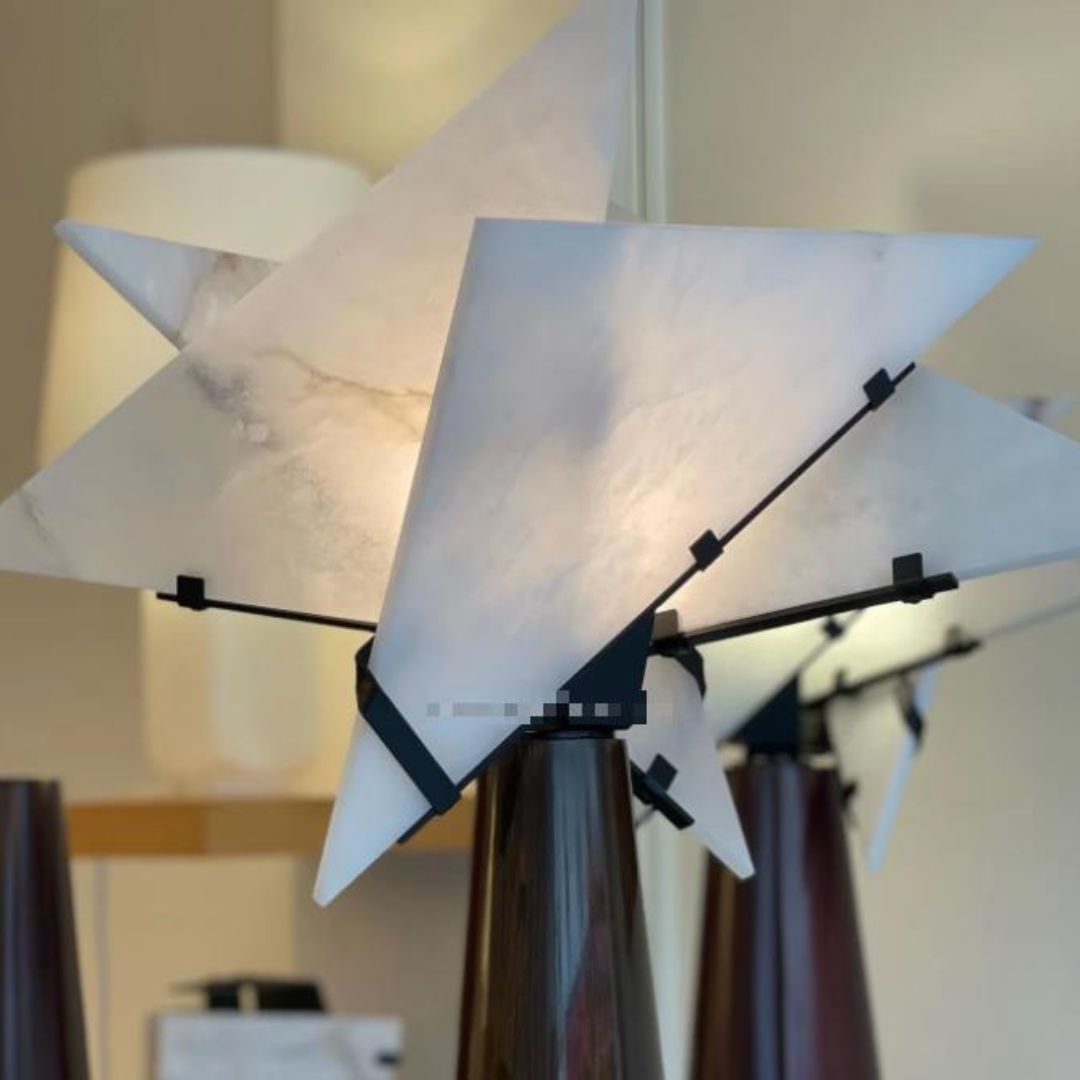 Trong phòng ngủ, chiếc đèn sàn marble thiết kế cánh mở không chỉ chiếu sáng mà còn giúp tạo ra sự thư giãn. Ánh vàng nhẹ phản chiếu qua marble mang lại cảm giác bình yên, khiến không gian trở nên ấm cúng và dễ chịu. Đây là lựa chọn tuyệt vời cho những người muốn phòng ngủ tối giản nhưng vẫn có điểm nhấn nghệ thuật.