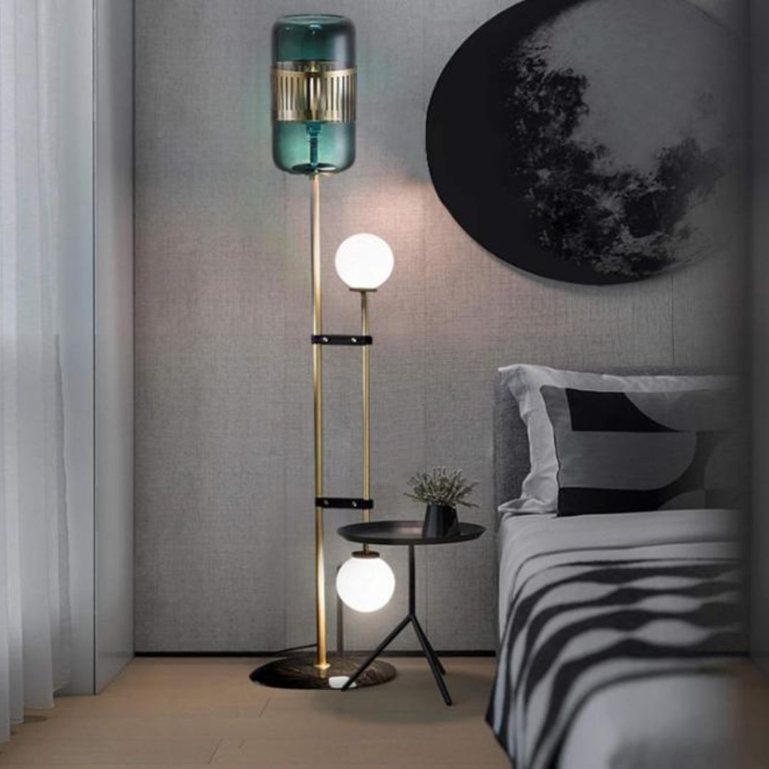 Một trong những điểm mạnh của đèn sàn trang trí luxury là hiệu ứng ánh sáng đa tầng. Sự kết hợp giữa chao kính trụ phía trên và các bóng tròn phía dưới giúp ánh sáng được phân bổ đều, tạo nên không gian ấm cúng. Ánh sáng không quá mạnh nhưng đủ để tạo cảm giác dễ chịu cho người sử dụng.