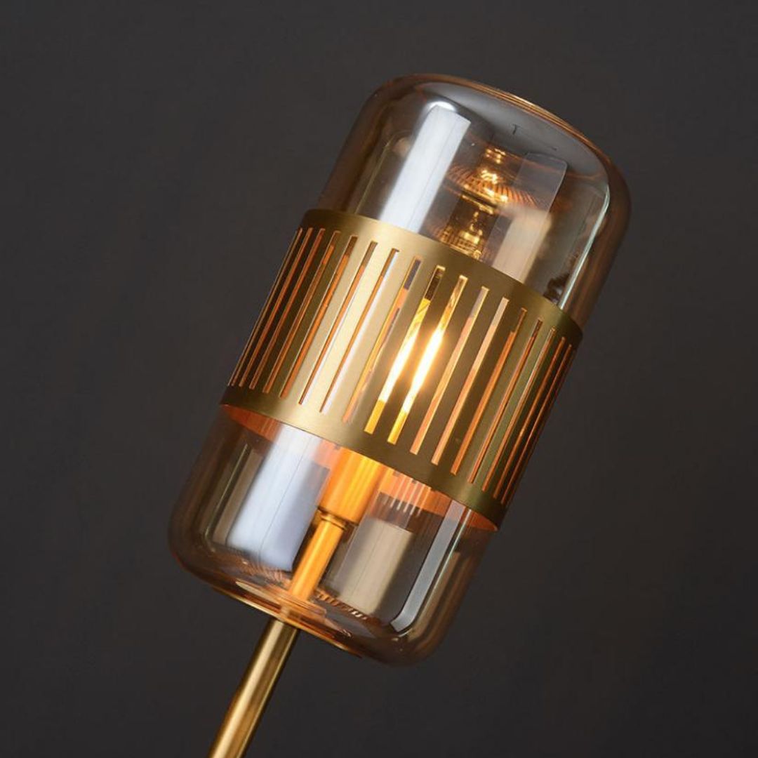 Thiết kế của đèn sàn trang trí luxury nổi bật với dáng đứng thanh mảnh cùng các tầng ánh sáng được sắp xếp hợp lý. Phần chao kính hình trụ ở phía trên tạo điểm nhấn chính, trong khi các bóng tròn nhỏ bên dưới bổ sung ánh sáng phụ, tạo nên tổng thể cân đối và bắt mắt. Kiểu dáng này giúp chiếc đèn vừa gọn gàng vừa mang tính nghệ thuật cao.