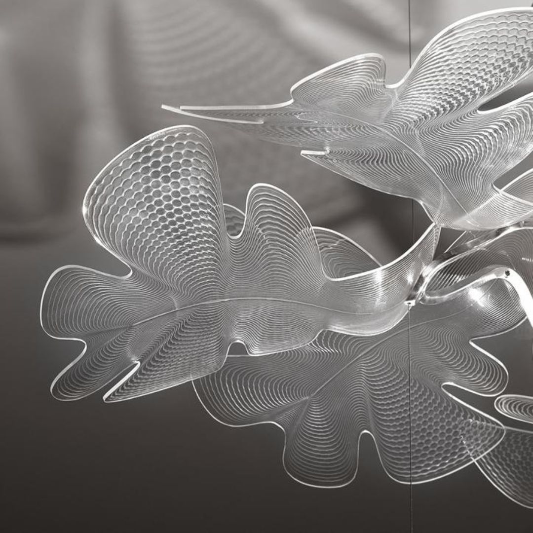 Điểm nổi bật nhất của đèn thả cánh hoa xếp tầng nằm ở cấu trúc cánh hoa được tạo hình mềm mại, có độ bo cong tự nhiên như đang uyển chuyển bay trong không gian. Mặc dù làm từ acrylic, hiệu ứng ánh sáng lại khiến từng cánh trở nên nhẹ nhàng và chân thực như cánh hoa thật. Thiết kế gồm 3 tầng: lớp cánh lớn bên dưới, lớp trung phía giữa và lớp nhỏ trên cùng. Sự sắp xếp này tạo chiều sâu, tạo chuyển động thị giác tinh tế, khiến chiếc đèn trở thành một tác phẩm điêu khắc ánh sáng ấn tượng.