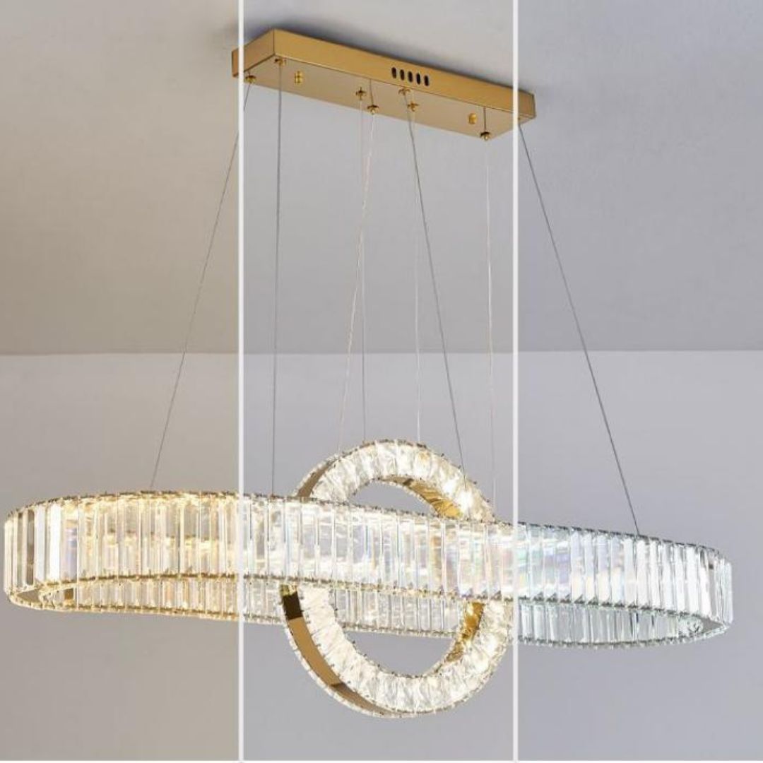 Không gian sống sẽ trở nên đẳng cấp hơn nhờ đèn thả pha lê vòng đôi. Thiết kế vòng đôi lồng nhau, viền pha lê cao cấp và ánh sáng vàng sang trọng tạo nên điểm nhấn tinh tế và sang trọng. Hệ treo cáp thanh thoát kết hợp khung kim loại màu vàng champagne không chỉ chắc chắn mà còn mang tính thẩm mỹ cao. Ba chế độ chiếu sáng linh hoạt giúp bạn dễ dàng điều chỉnh ánh sáng cho phù hợp với không gian, từ phòng khách, phòng ăn đến phòng họp hoặc phòng đọc sách.