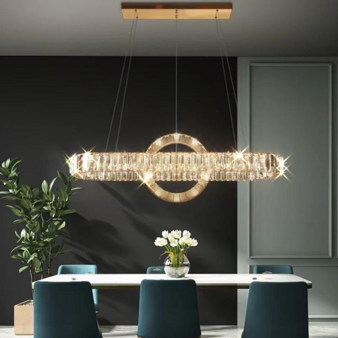 Đèn thả pha lê vòng đôi khi đặt trên bàn ăn mang đến hiệu ứng ánh sáng vàng phản chiếu tinh tế, khiến không gian trở nên ấm cúng và đậm chất nghệ thuật. Sự lấp lánh từ viền pha lê giúp bữa ăn gia đình thêm phần sang trọng và trọn vẹn cảm xúc. Đây cũng là xu hướng trang trí phổ biến trong các căn hộ cao cấp, nhà phố hiện đại, nơi ánh sáng không chỉ để chiếu sáng mà còn góp phần tạo nên phong cách sống tinh tế và tràn đầy sự gắn kết.