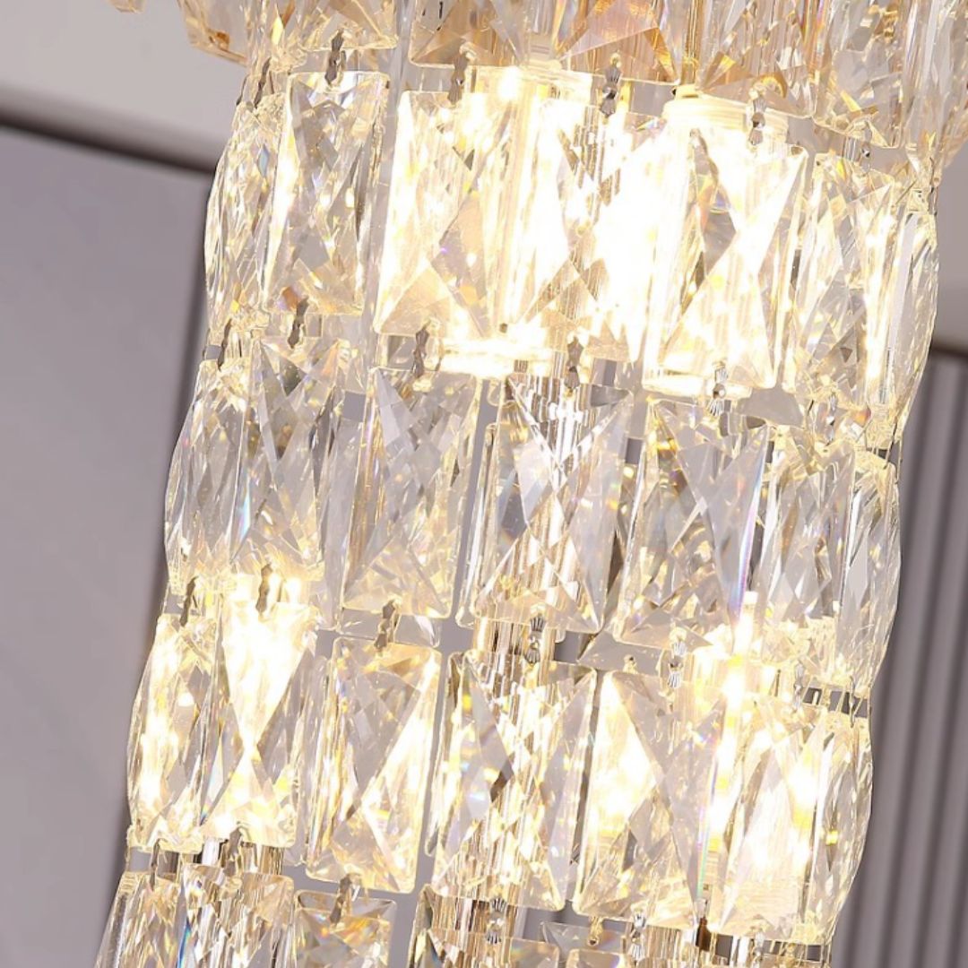 Đèn thả thông tầng pha lê K9 được thiết kế với 7 tầng, tạo thành một chuỗi ánh sáng thông từ lớn đến nhỏ. Các tầng được sắp xếp theo thứ tự giảm dần, mang lại hiệu ứng thị giác tuyệt đẹp và cảm giác cân đối, hài hòa. Thiết kế này không chỉ làm nổi bật chiều cao của không gian mà còn tạo nên sự ấn tượng mạnh mẽ, đặc biệt là trong các khu vực như cầu thang, sảnh lớn hay thông tầng biệt thự.