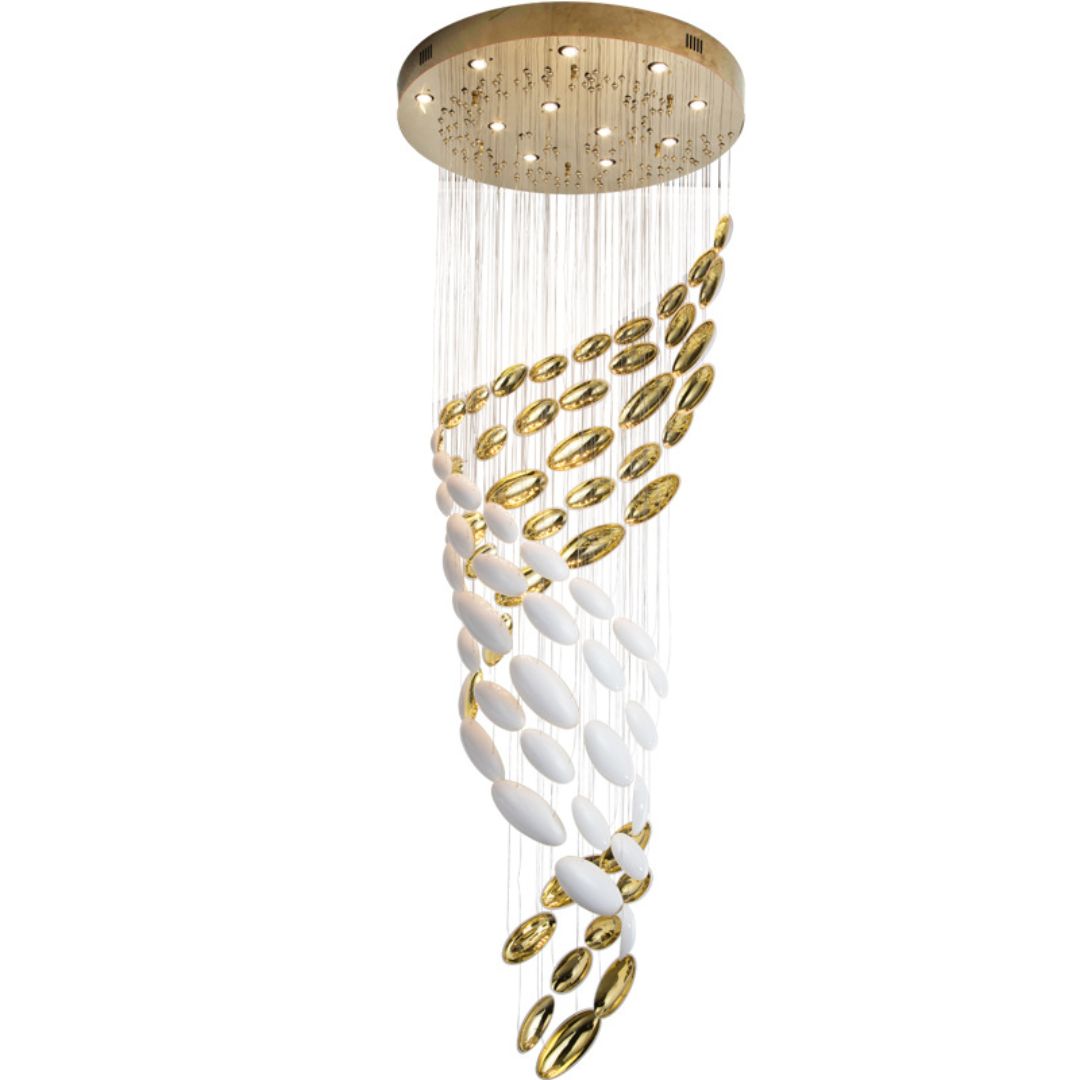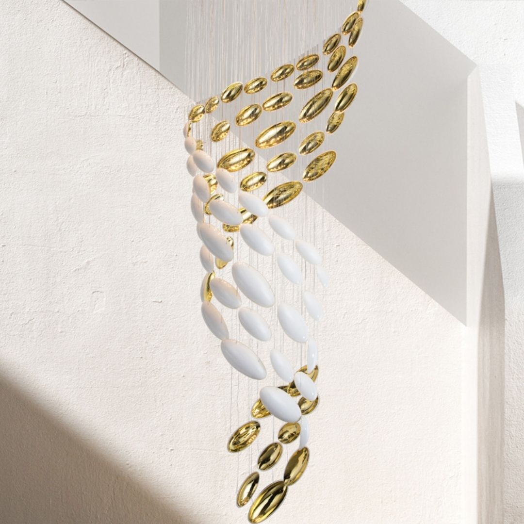 Đèn thả thông tầng quả trứng với thiết kế xoắn ốc mang đến cảm giác mềm mại và chuyển động trong không gian. Những quả trứng thủy tinh với hai màu trắng và vàng được sắp xếp đan xen khéo léo, tạo ra hiệu ứng thị giác độc đáo. Sự kết hợp hài hòa giữa các quả trứng và hình dáng xoắn ốc không chỉ làm tăng tính thẩm mỹ mà còn giúp ánh sáng phân bổ đều khắp không gian. Đây là mẫu đèn lý tưởng cho các không gian cao và rộng, nơi nó có thể phát huy hết vẻ đẹp và sự sang trọng.
